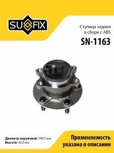 Ступица задняя в сборе с ABS SUFIX SN-1163. Применение: CITROEN C4 Aircross 1.6-2.0 11>, MITSUBISHI ASX 1.6-1.8D 10> / Outlander(GF) 2.0-2.4 12>, PEUGEOT 4008 1.6-1.8D 12>.