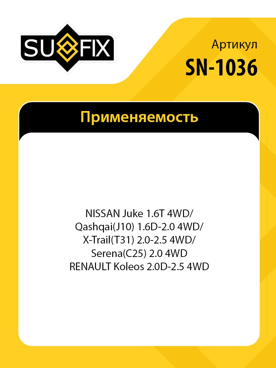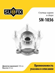 Ступица задняя в сборе SUFIX SN-1036. Применение: NISSAN Juke 1.6T 4WD 10> / Qashqai(J10) 1.6D-2.0 4WD 07> / X-Trail(T31) 2.0-2.5 4WD 07> / Serena(C25) 2.0 4WD 05>, RENAULT Koleos 2.0D-2.5 4WD 08>.