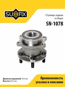 Ступица задняя в сборе SUFIX SN-1078. Применение: SUBARU Forester(SH) 2.0-2.5 08> / Impreza(GH) 1.5-2.0D 4WD 08> / Legacy V 2.0-2.5 09>.