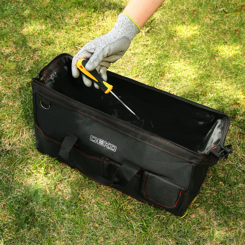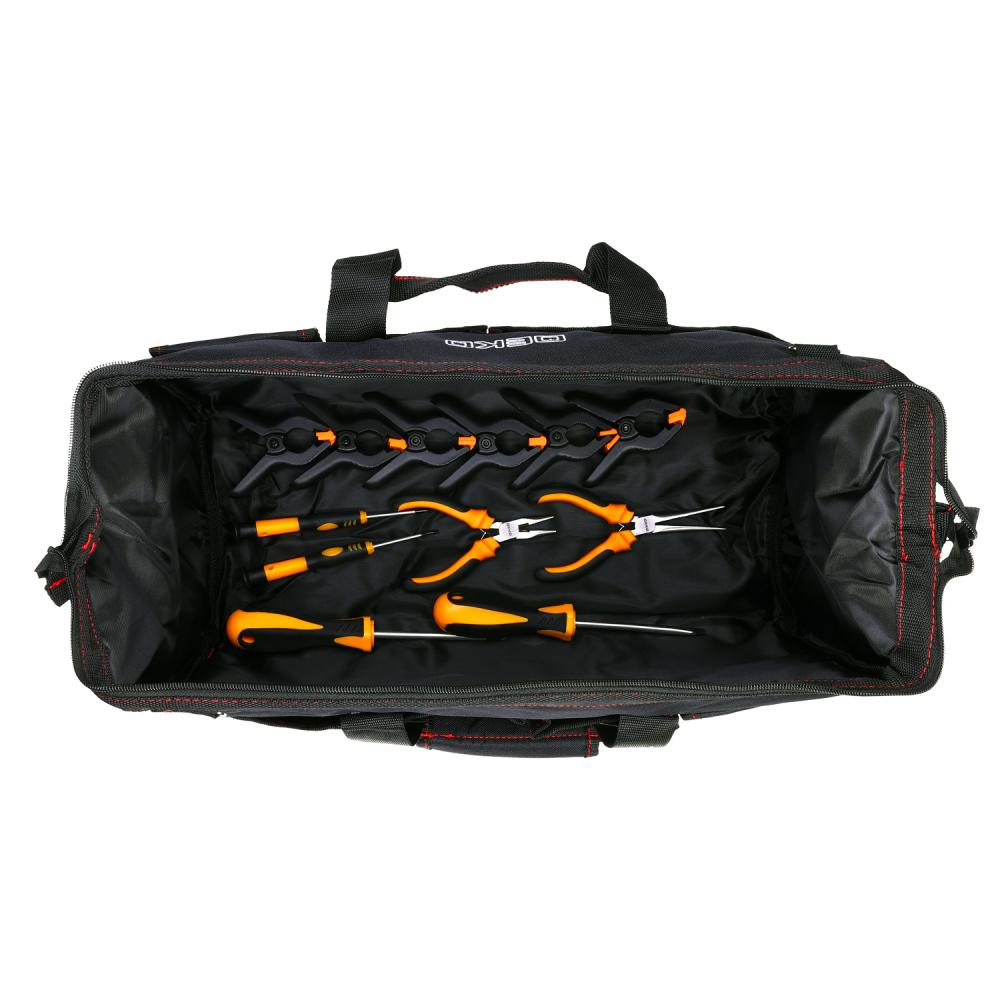 Особое внимание заслуживает материал сумки — прочный полиэстер, который отличается высокой износостойкостью и устойчивостью к загрязнениям. Такой материал не только надежно защищает содержимое от влаги и пыли, но и сохраняет презентабельный внешний вид даже при интенсивной эксплуатации. Надежная молния обеспечивает легкое открытие и закрытие сумки, предотвращая случайное выпадение инструментов и гарантируя их сохранность во время транспортировки.