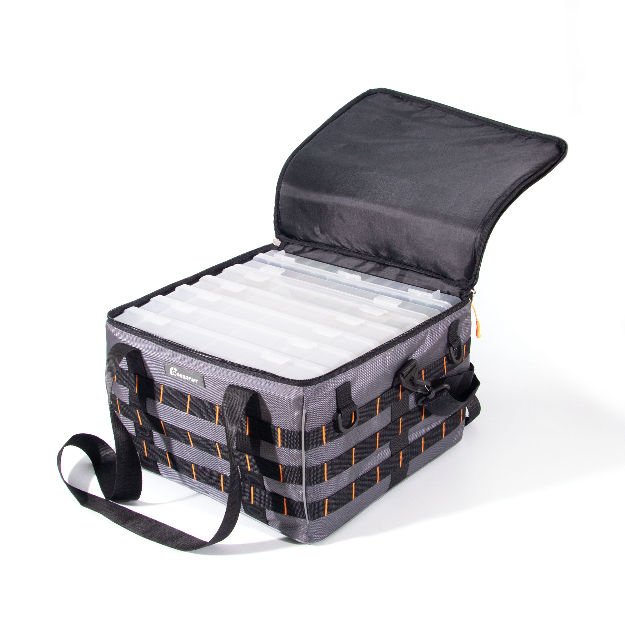 Сумка рыболовная СЛЕДОПЫТ Base Lure Bag XXL, 38х38х25 см, цв. серый + 7 коробок Luno 28/2/