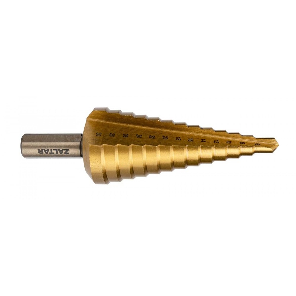 Сверло ступенчатое ZALTAR HSS TiN, Gr.3, Ø6-30 мм, прямая канавка, трёхплоскостной хвостовик