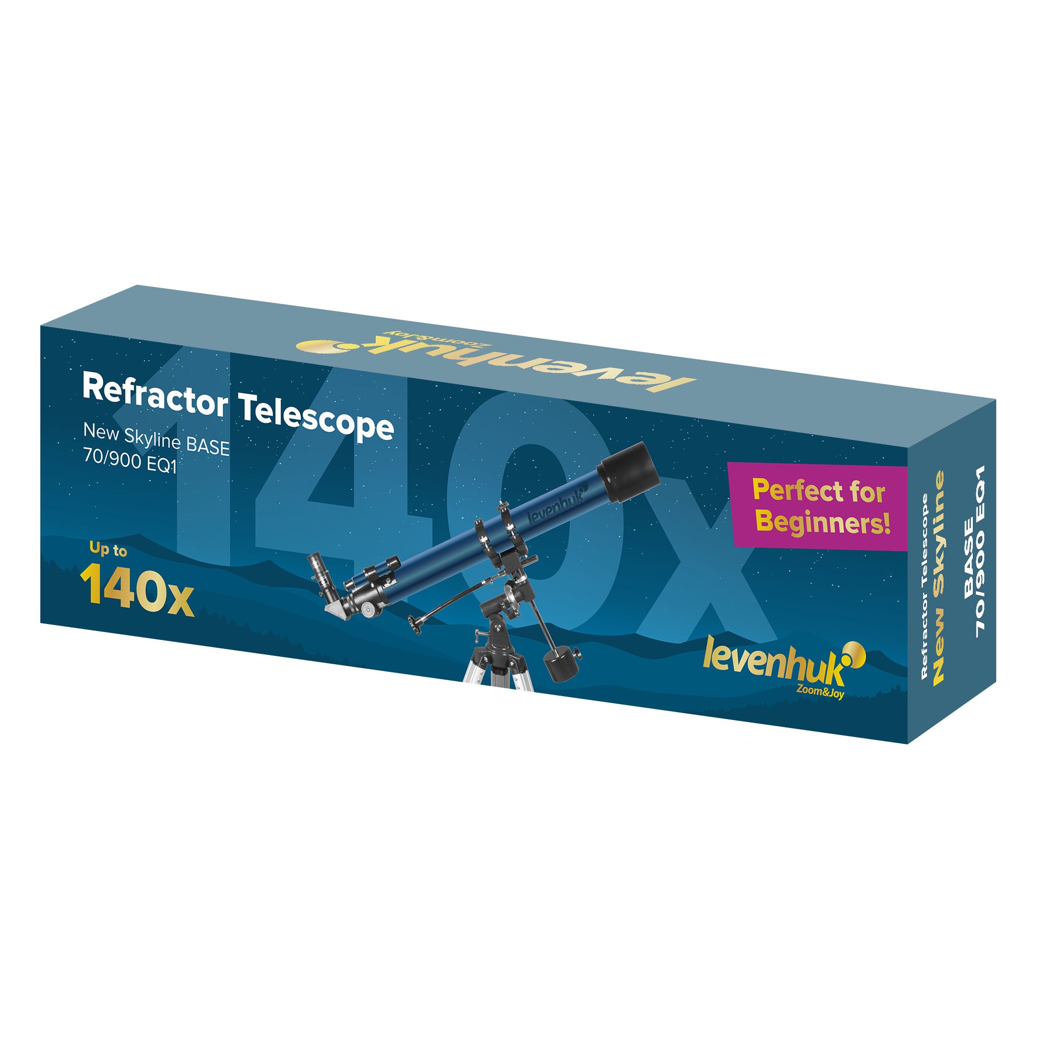 Levenhuk New Skyline BASE 70/900 EQ1 – это ахроматический телескоп-рефрактор на экваториальной монтировке, который подходит для наблюдения Луны, планет Солнечной системы и наземных объектов. В этой модели есть все, что нужно начинающему астроному: оптика с просветлением – для яркой картинки; пара окуляров и линза Барлоу – для разных увеличений; диагональное зеркало – для наблюдения наземных объектов. Телескоп и аксессуары помещены в красочную упаковку, поэтому Levenhuk New Skyline BASE 70/900 EQ1 – еще и отличный вариант для подарка.
