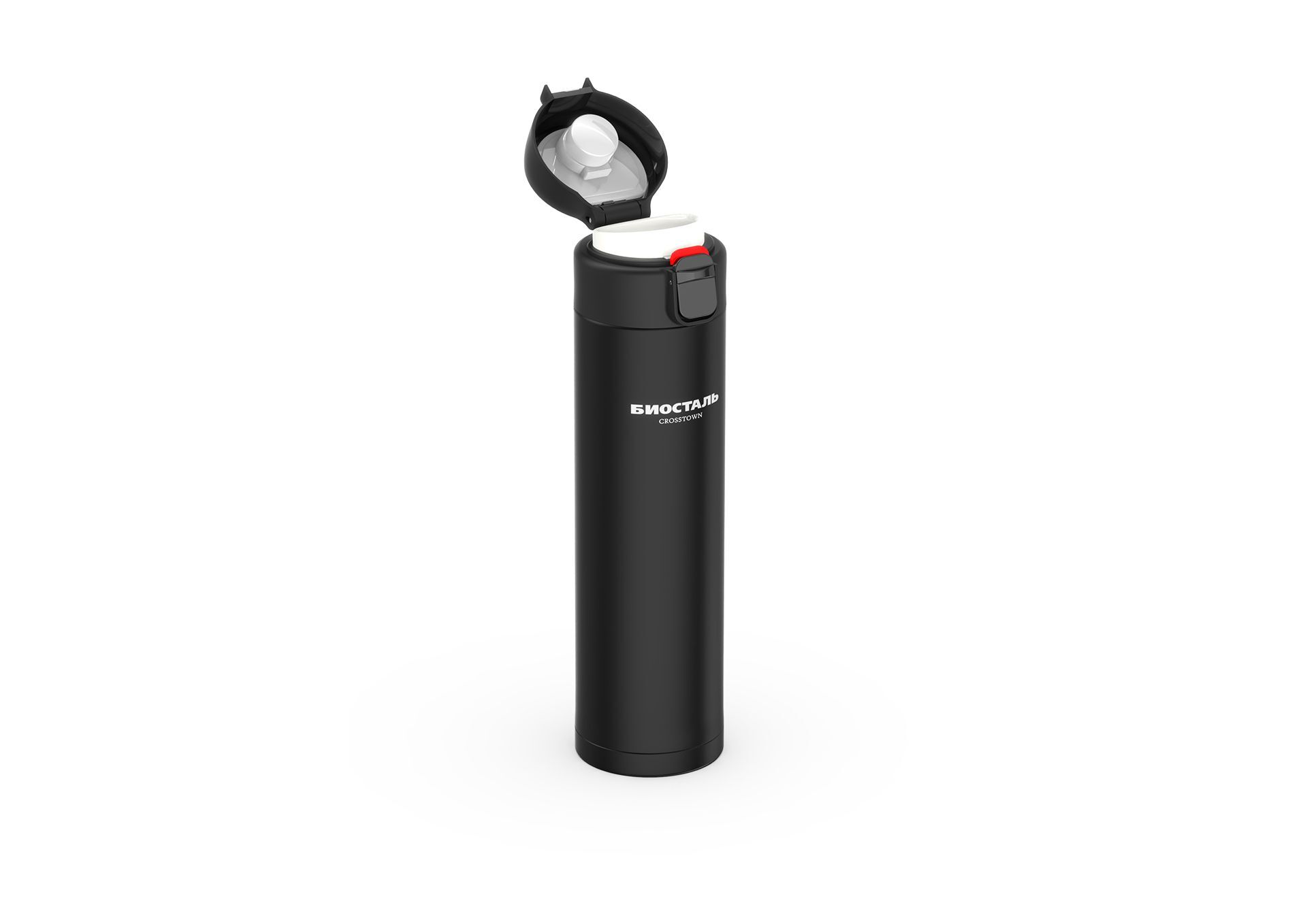 Термос-кружка Biostal Crosstown с увеличенным объёмом 520 мл. Кнопка-предохранитель на крышке блокирует замок для защиты от случайного открывания.