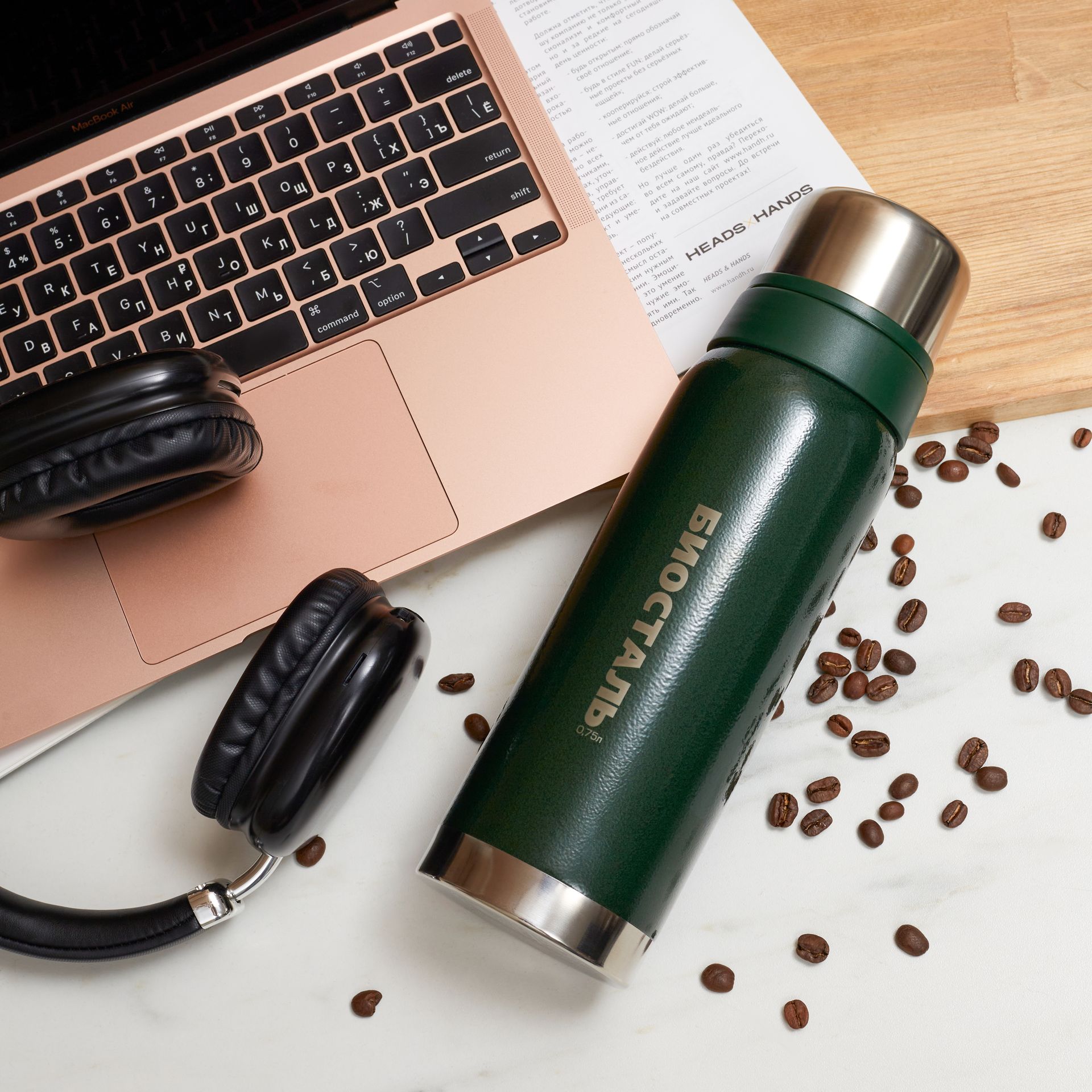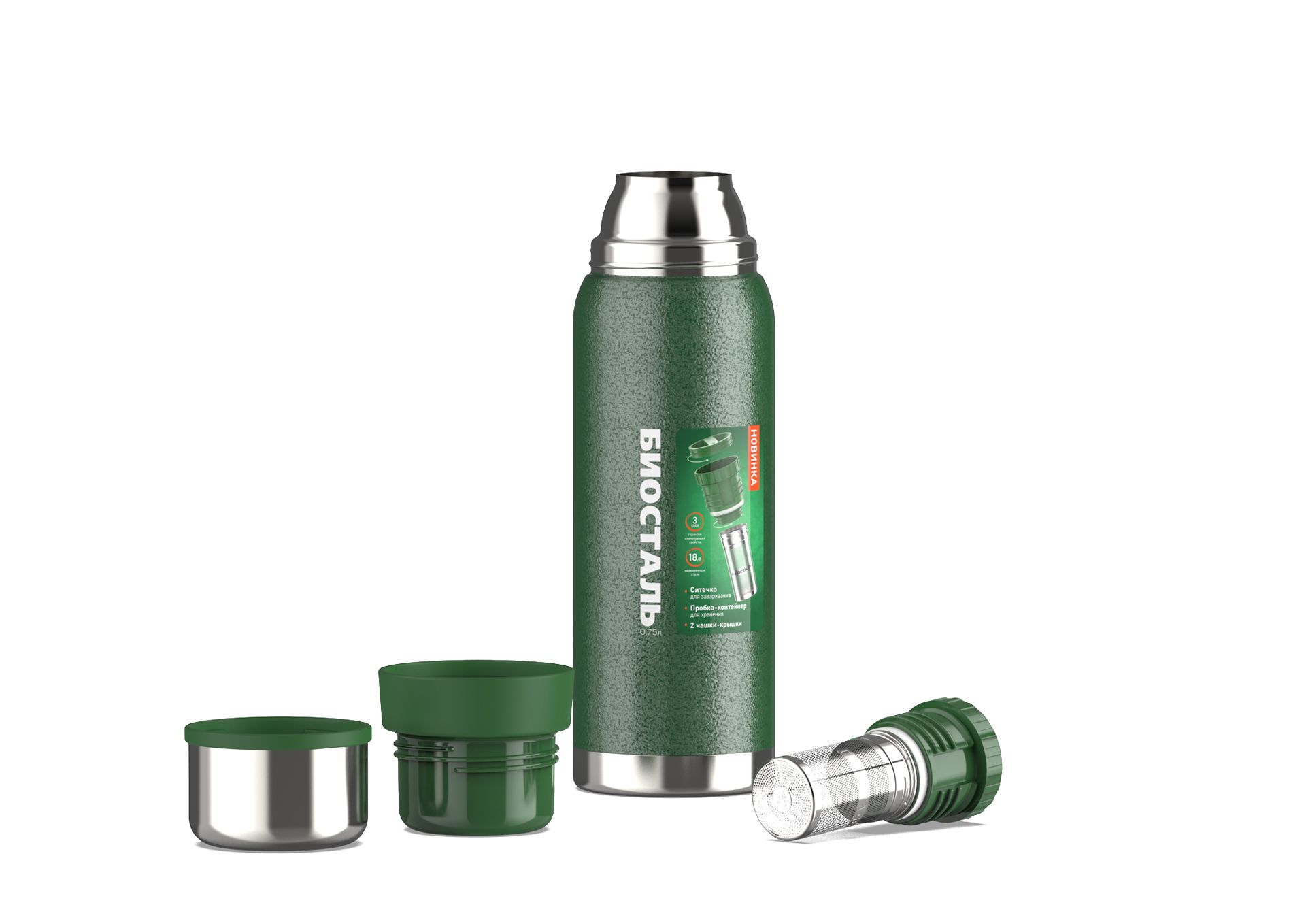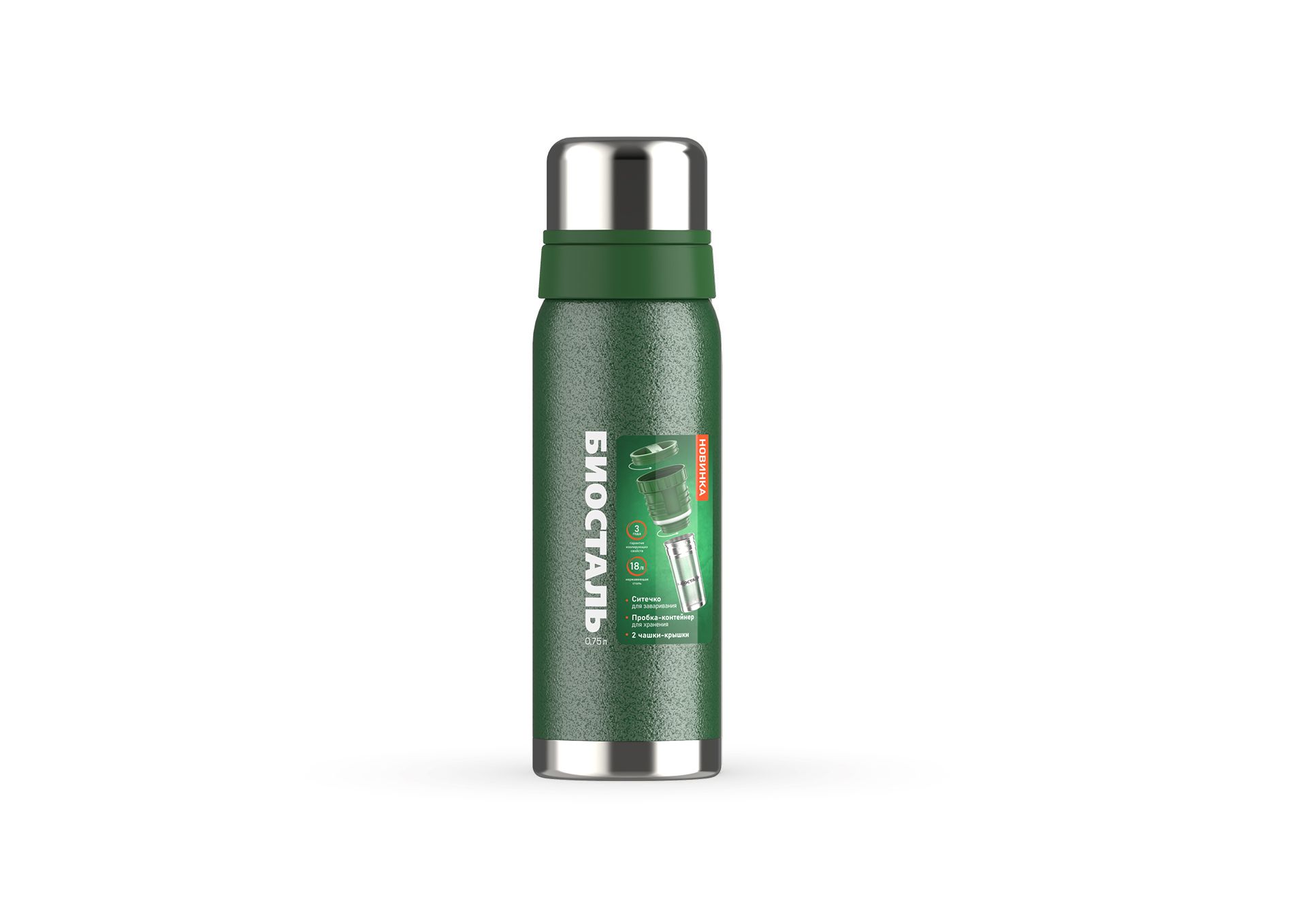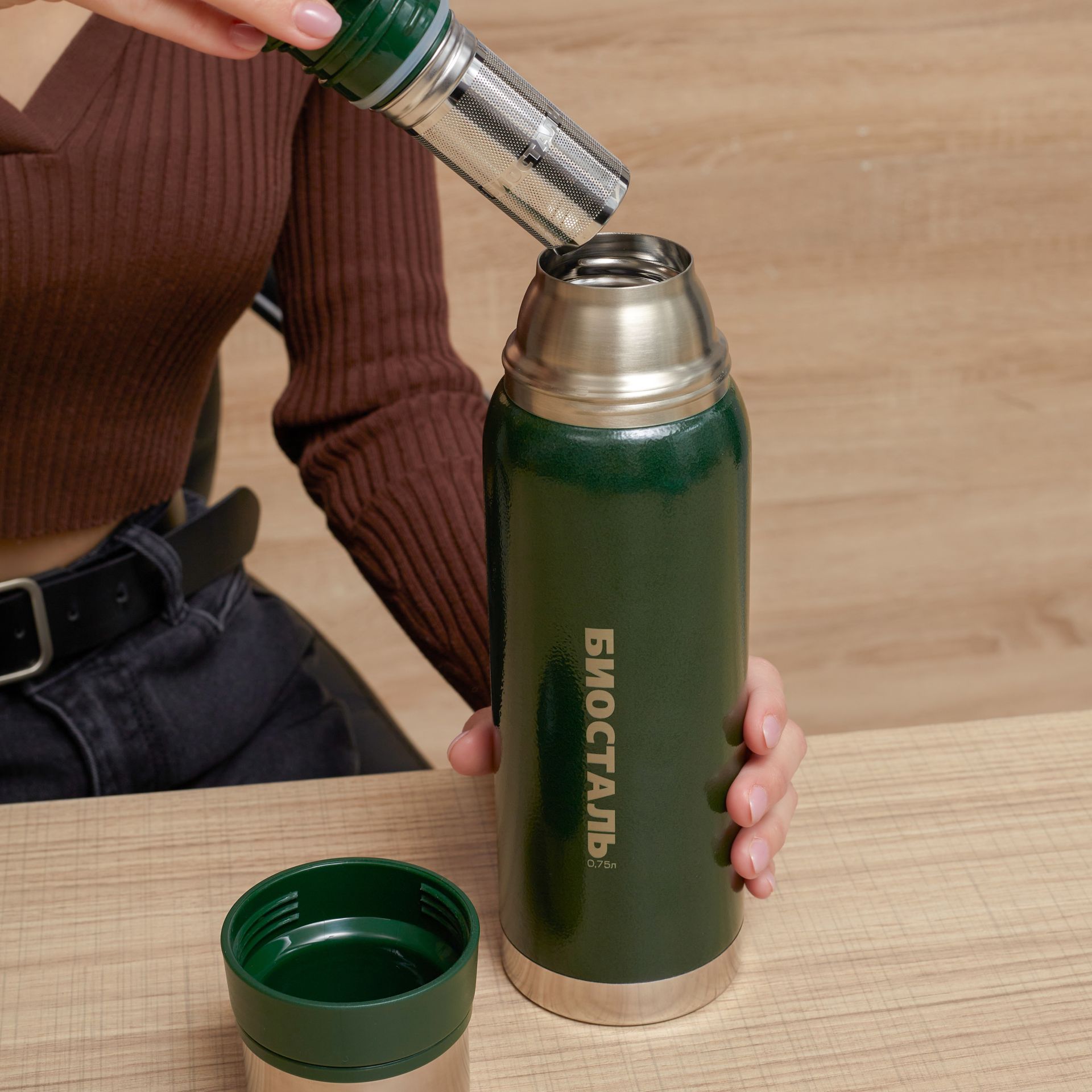 Термос Biostal Охота (0,75 литра), 2 чашки, с ситечком, зеленый