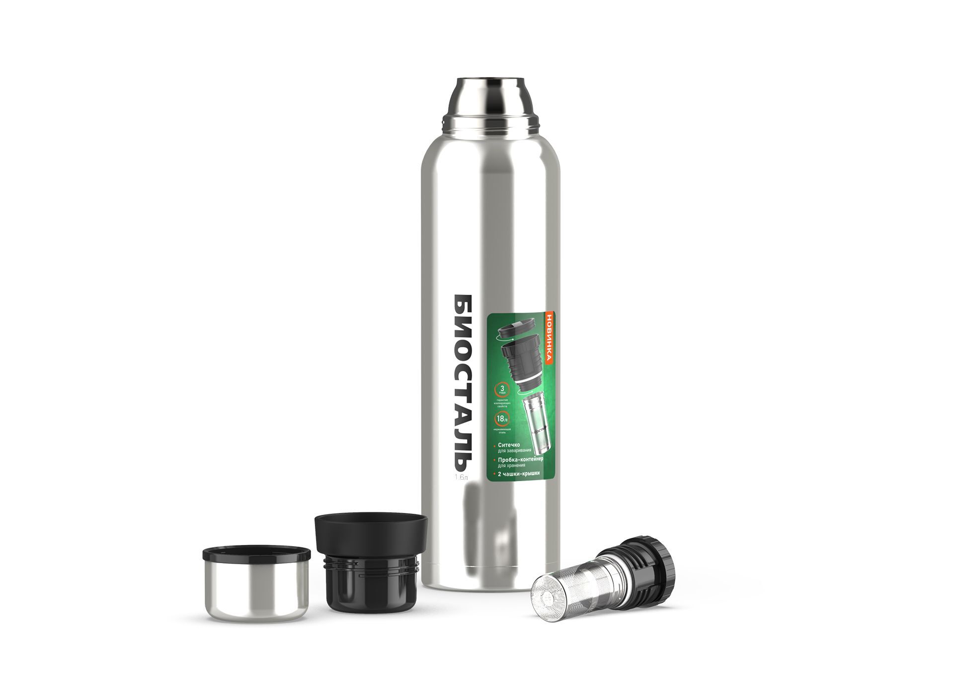 Термос Biostal Охота (1,6 литра), 2 чашки, с ситечком, стальной