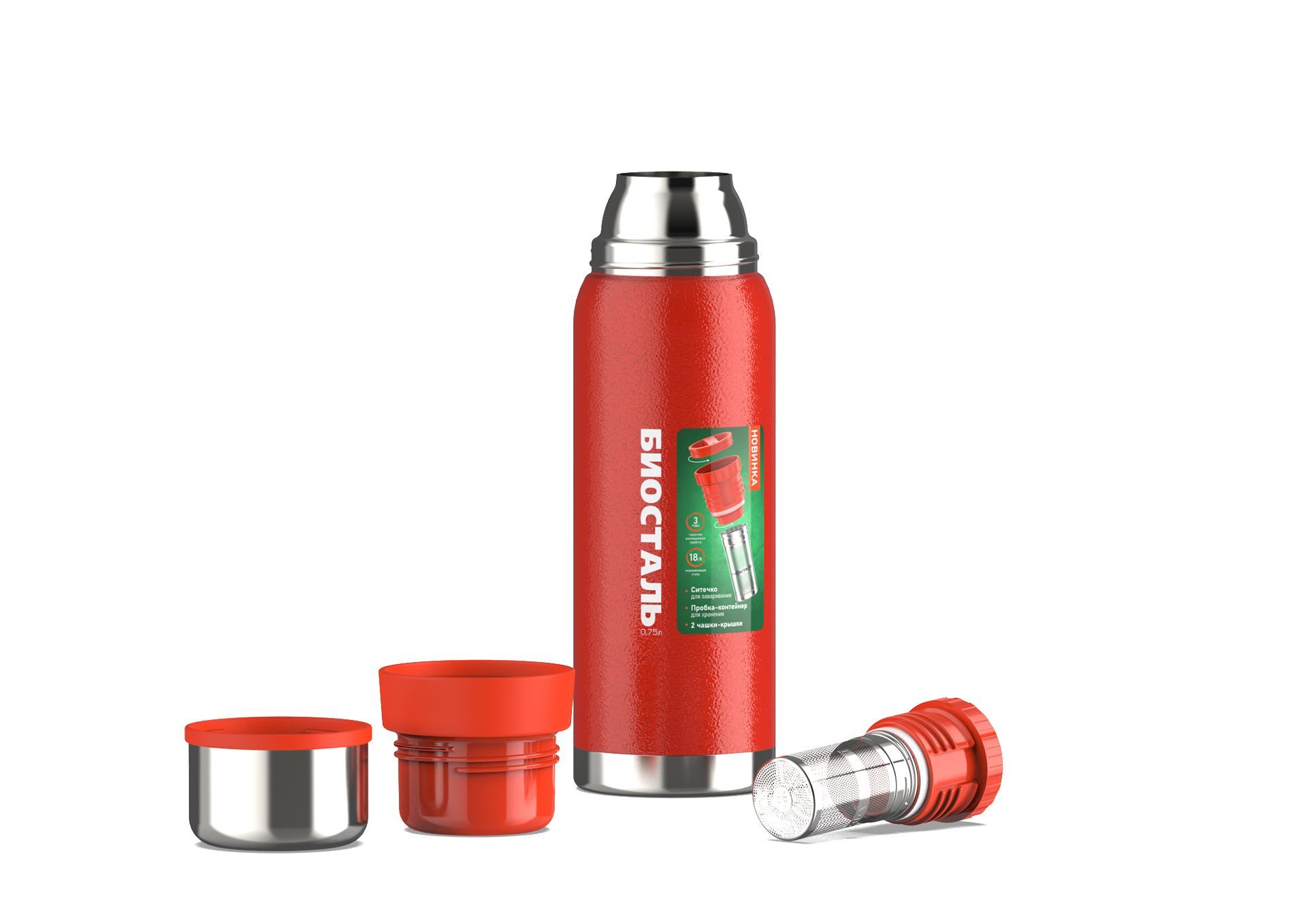 Термос Biostal Охота (0,75 литра), 2 чашки, с ситечком, красный