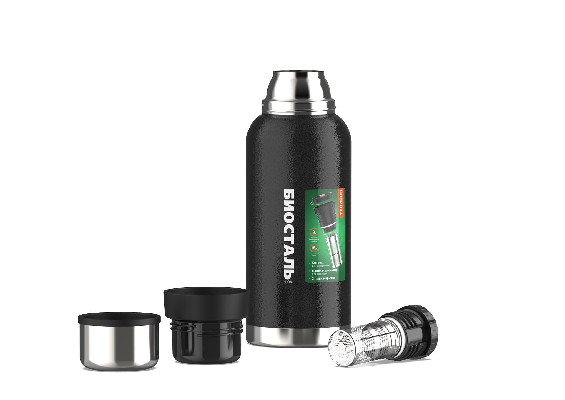 Термос Biostal Охота (1 литр), 2 чашки, с ситечком, черный