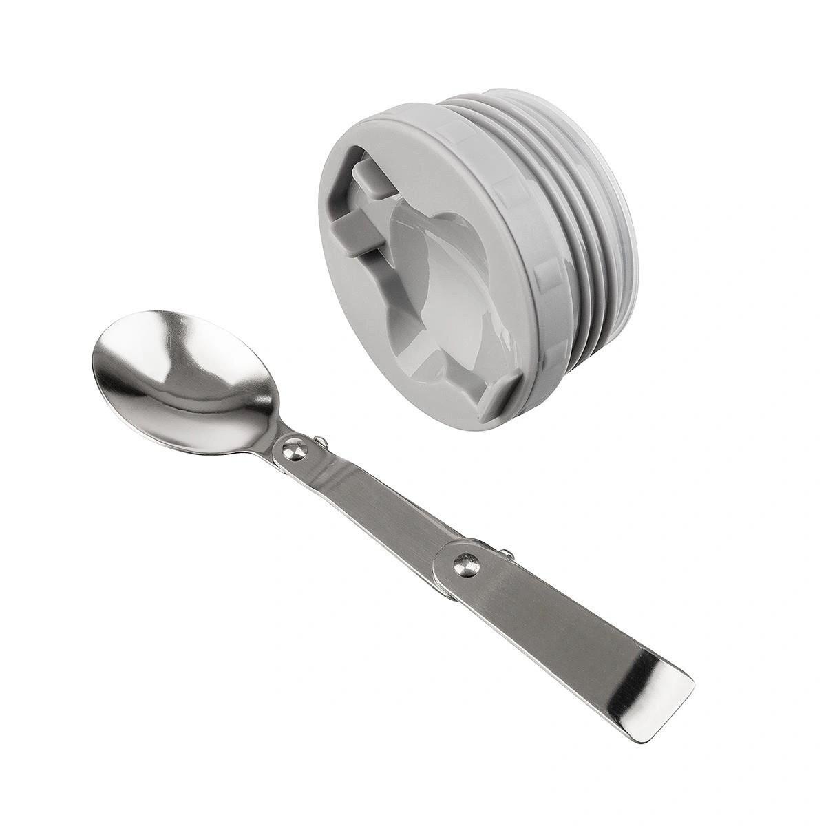 Термос с ложкой - отличный вариант для автопутешествий, походов на пикник, на рыбалку или охоту. Широкое горло, вместительная крышка-чашка и металлическая складная ложка позволят использовать термос для первых и вторых блюд. Корпус термоса изготовлен из высококачественной нержавеющей стали с защитным покрытием. Складная ложка размещается в верхней части пробки. Пробка надежно закрывает колбу и проста в использовании.