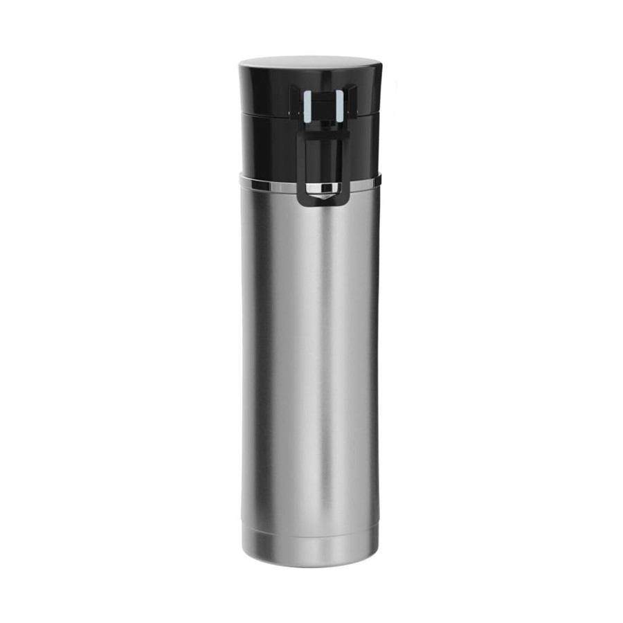 Особый комфорт при использовании термокружки обеспечивается за счет эргономичной формы и оригинальной конструкции крышки-пробки. Пить из ёмкости можно даже на ходу, не снимая крышку-пробку – достаточно отогнуть блокировочное колечко и нажать на кнопку, верхняя крышка мгновенно откидывается, фиксируясь в открытом положении, и не опрокидывается в процессе питья. В крышке-пробке предусмотрены два отверстия – питьевое и воздушное, обеспечивающее плавный поток жидкости. Кольцо, фиксирующее крышку в закрытом положении, предотвращает случайное открывание, поэтому термокружку безопасно носить в сумке или рюкзаке. Компактные размеры позволяют разместить термокружку в автомобильном подстаканнике или велосипедном держателе.
