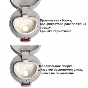 Правила пользования термос-кружкой: Перед первым использованием промойте термос-кружку горячей водой с жидким моющим средством. Прежде чем заливать горячую жидкость, сполосните внутреннюю колбу горячей водой. Это поможет дольше сохранить температуру. Во избежание ожогов при открывании крышки, не переполняйте термос-кружку, оставляя некоторое пространство внутри него. После заполнения термос-кружки необходимо проверить, чтобы крышка была плотно завинчена. Во избежание проливания напитков во время хранения их в термос-кружке, необходимо кнопку крышки ставить на предо- хранитель. Важно! Во избежание протекания, после того как нальете горячий напиток, спустя несколько секунд необходимо открыть кнопкой крышку и выпустить избыточное давление пара, затем заново закрыть. Для того чтобы крышка термос-кружки сохраняла свои герметичные свойства, следуйте инструкции по ее сборке и хранению. После каждого мытья и разборки частей крышки, всегда собирайте ее согласно инструкции. В поилке термос-кружки предусмотрено 2 фиксатора, которые позволяют плотно соединить части крышки между собой и избежать протекания. Обратите внимание на их правильное положение оба фиксатора находятся сверху. Во избежания протечки жидкости, после каждого разбора крышки, необходимо собрать ее в правильном порядке. На рисунке представлена неправильная сборка. Не допускается использование термос-кружки в микроволновых печах, посудомоечных машинах, держать вблизи нагревательных приборов, мыть щелочными растворами. Не рекомендуется хранить в термосе соленые, газированные напитки, молочные продукты. Не рекомендуется оставлять жидкость в термос-кружке на срок более 16 часов. Следует оберегать термос-кружку от механических повреждений (падений, ударов и т.п.), которые могут привести к снижению эффективности изделия. Заполненный термос-кружку рекомендуется хранить в вертикальном положении. Храните пустой термос-кружку с открытой крышкой.