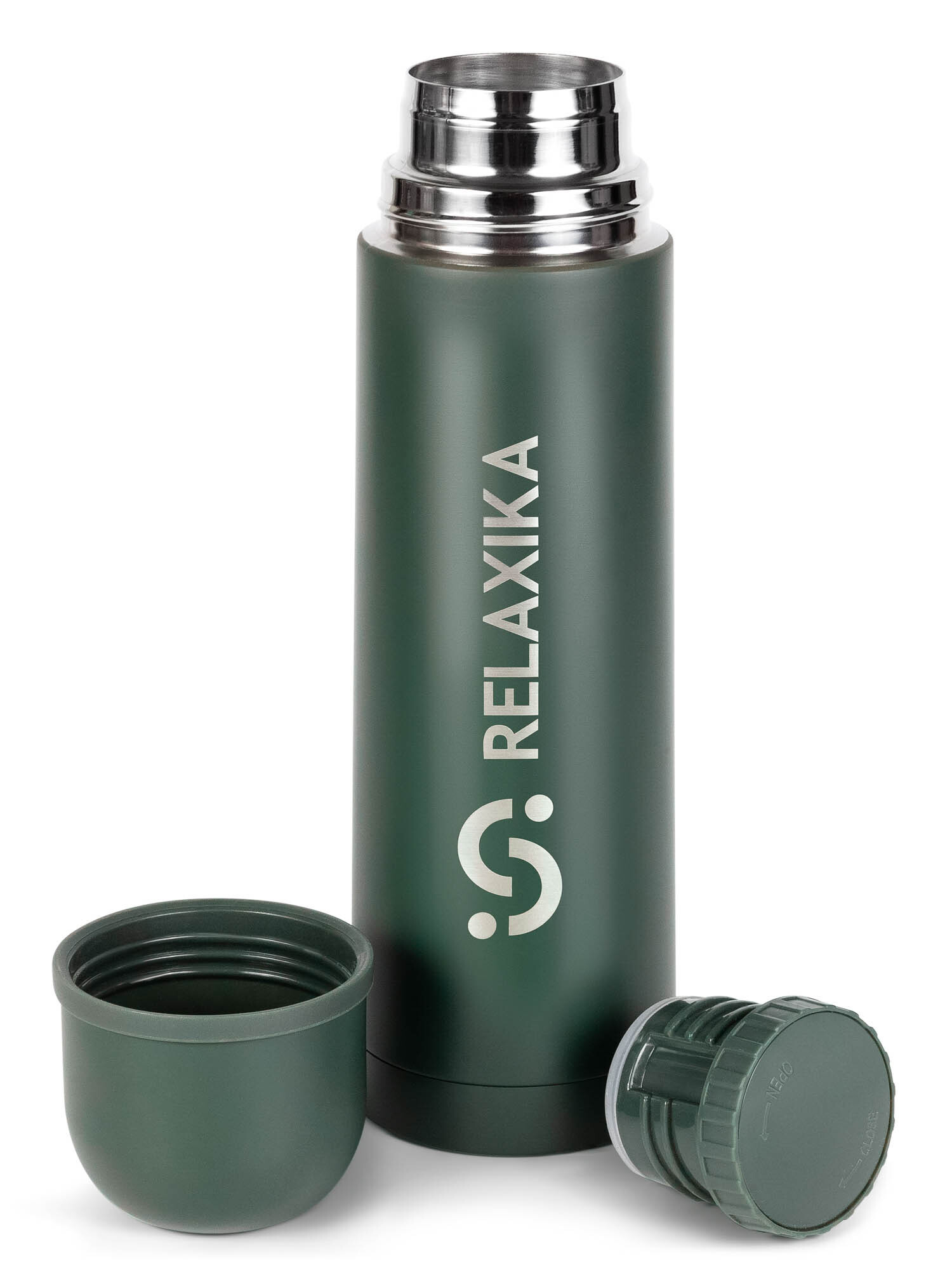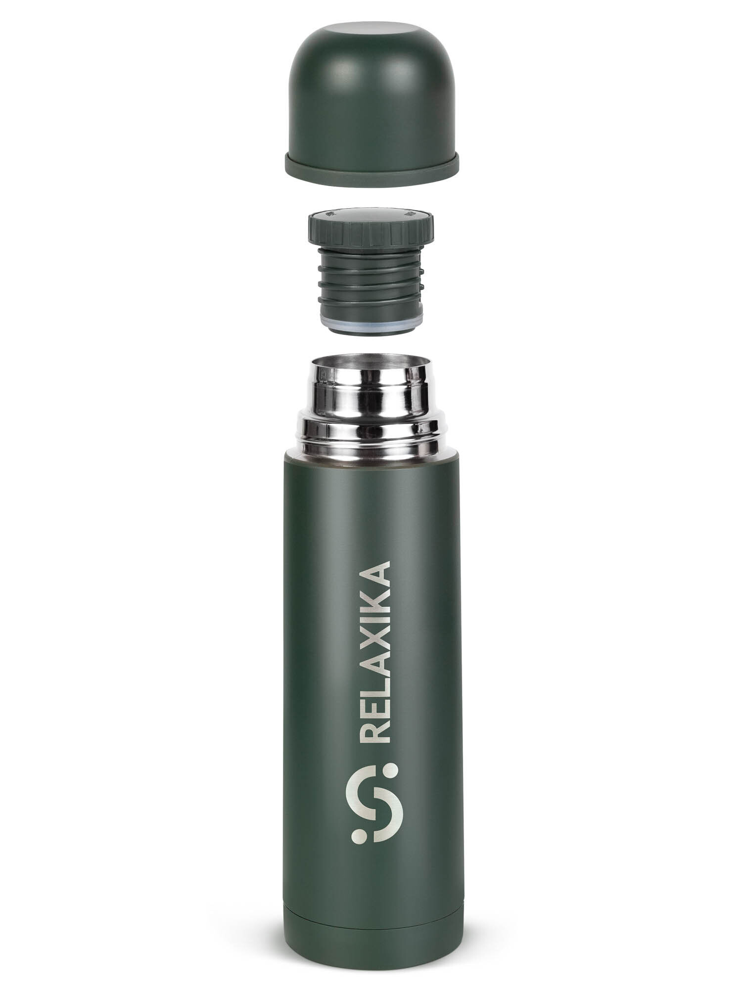 Классический термос Relaxika с высокими показателями удержания температуры напитка для походов, путешествий, спорта и ежедневного использования. Прочные двойные стенки из высококачественной нержавеющей стали 18/8 с вакуумной изоляцией гарантируют, что ваш напиток останется холодным в течение 28 часов и горячим до 22 часов. Этот материал не только прочен, но и гигиеничен, не выделяет никаких вредных для здоровья веществ. Ваши напитки сохраняет естественный вкус и не приобретут посторонний запах.