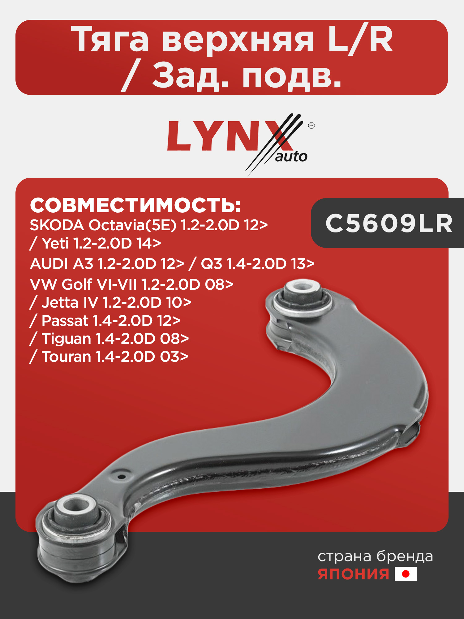 Тяга верхняя L/R / Зад. подв. LYNXauto C5609LR. Применение: AUDI A3 1.2-2.0D 12> / Q3 1.4-2.0D 13>, SKODA Octavia(5E) 1.2-2.0D 12> / Yeti 1.2-2.0D 14>, VW Golf VI-VII 1.2-2.0D 08> / Jetta IV 1.2-2.0D 10> / Passat 1.4-2.0D 12> / Tiguan 1.4-2.0D 08> / Touran 1.4-2.0D 03>.