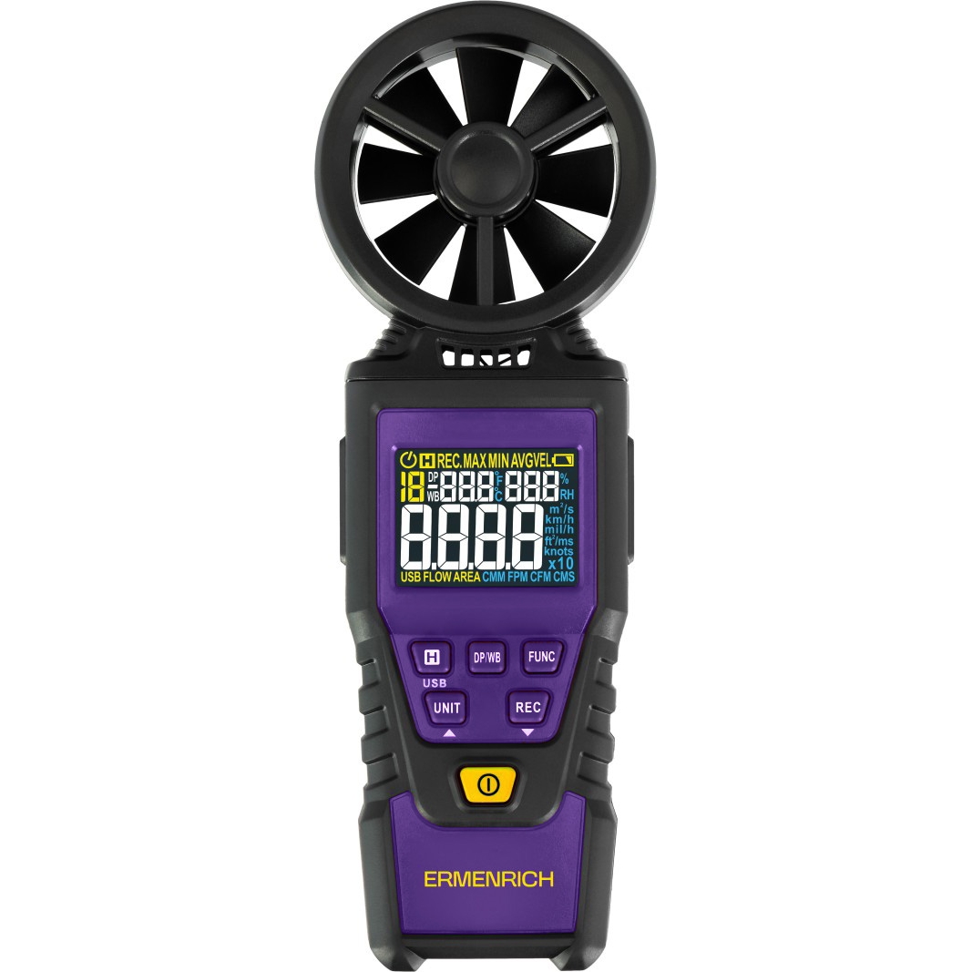 Цифровой анемометр Ermenrich Seek DN30 — компактный трёхфункциональный прибор, объединяющий анемометр, термометр и гигрометр в одном корпусе. Подходит для измерений на открытом воздухе и в помещениях: идеален для метеонаблюдений, вентиляционных работ, сельского хозяйства и бытового использования.