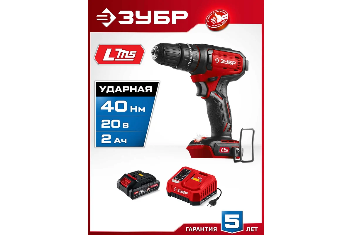 ЗУБР 20 В, 40 Н·м, 1 АКБ LMS (2 А·ч), ударная дрель-шуруповерт ДШУ-40-21 - компактная и недорогая дрель-шуруповерт ударная ЗУБР предназначена для сверления и заворачивания. Эргономичный дизайн, производительный двигатель и настроенная муфта момента позволяет выполнять точный работы легко и без усилий. Комплектация с аккумулятором позволяет начать работу сразу после покупки.