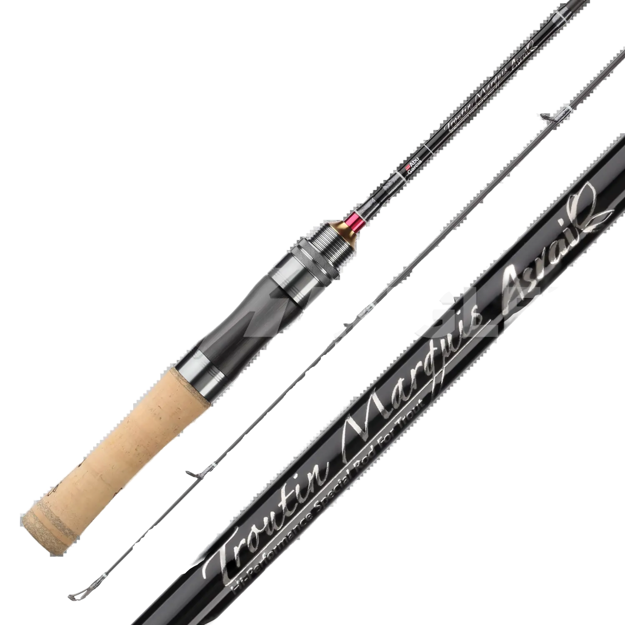 Abu Garcia Troutin Marquis Asrai TMAS - серия высококлассных спиннинговых удилищ внутреннего японского рынка, разработанная для ловли форели и других лососевых пород рыб. Построены на сверхлёгких бланках из высокомодульного карбона 40T carbon, причем верхняя секция выполнена из карбона Toray T1100G, что обеспечивает прочность удилища и гибкость, а также способность дальнего заброса микро приманок и сверхвысокую чувствительность, позволяющую ощутить даже самые слабые поклевки и моментально выполнить подсечку. На спиннингах применены лёгкие направляющие кольца из нержавеющей стали по концепции Fuji K Guide, кольца из алконита, прекрасно работающие с тонкими шнурами и лесками и способствующие дальнему забросу. Оригинальный деревянный катушкодержатель с рукояткой качества AAA. В линейке представлены как короткие модели для ловли на ручьях и стесненных условиях ловли, где необходим заброс снизу, с переворотом, кикингом и т.п., а также полноразмерные модели для ловли в устьях рек и на озерах. Также есть и многочастные модели, которые будут актуальны во время путешествий.