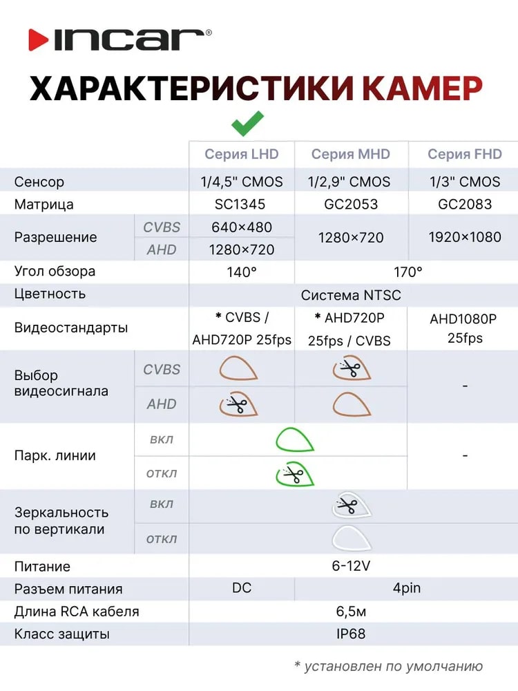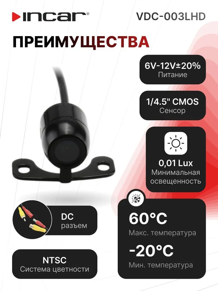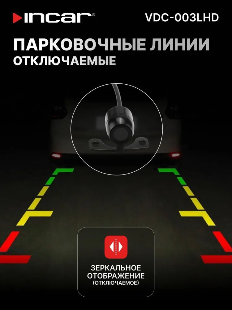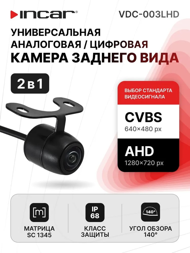 Универсальная CVBS/AHD камера INCAR 720P (1280×720) с углом обзора 150° и рабочим напряжением 6–12 В — это устройство для записи видео в автомобилях, например, в качестве камеры заднего вида.