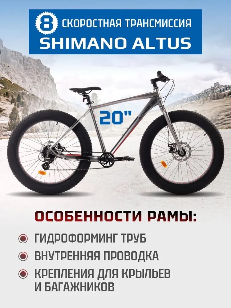 Велосипед с широкими покрышками (фэтбайк) и оборудованием начального любительского класса Shimano, 8 скоростей.