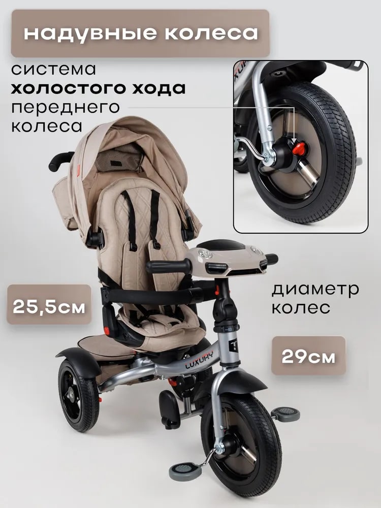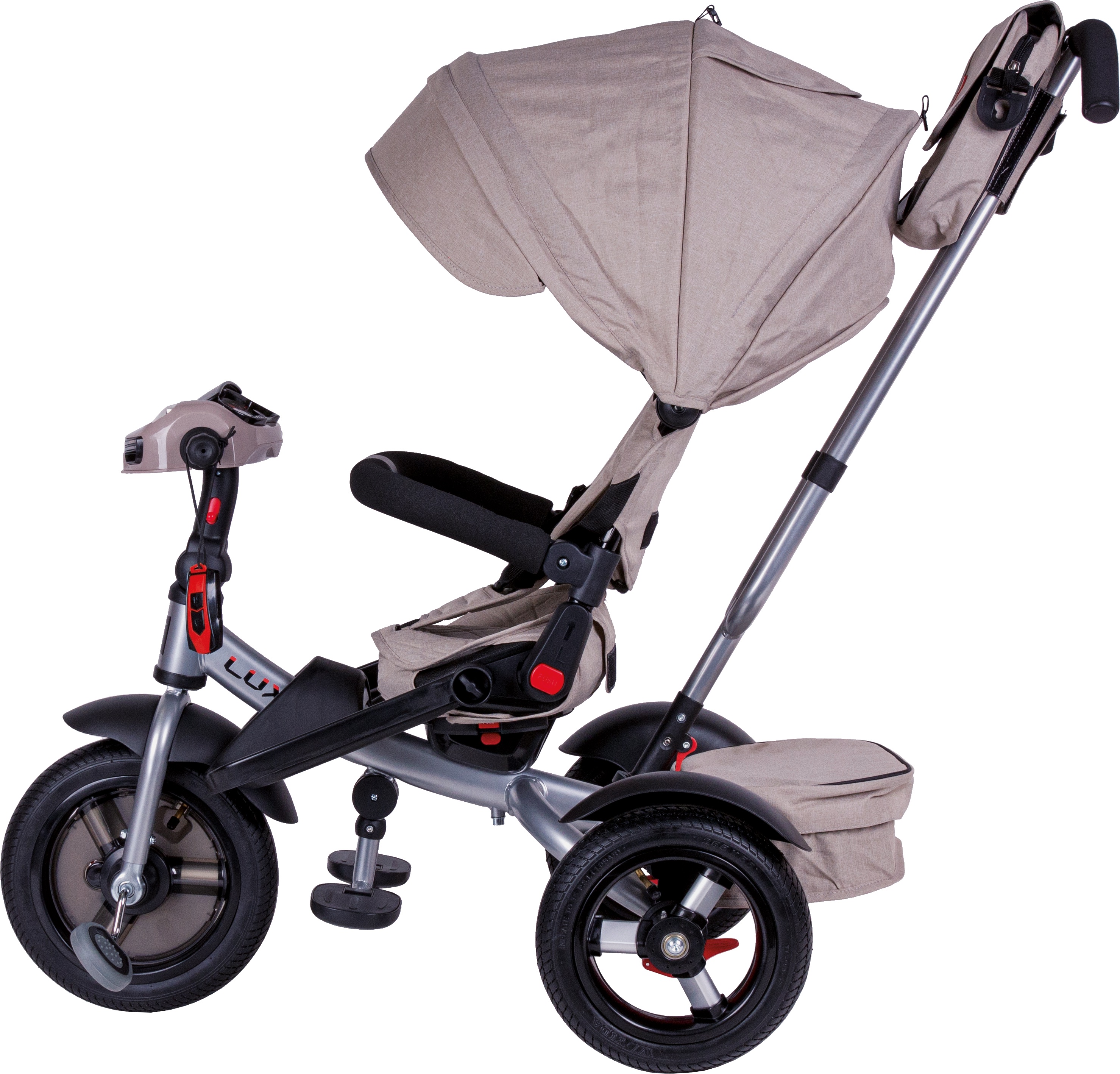Luxury - модель популярного детского трехколесного велосипеда-коляски для малышей с ручкой. Большие надувные колеса обеспечивают хорошую проходимость, поэтому малыш сможет крепко спать, пока коляска плавно едет под управлением родителей. Во время бодрствования ребенок не будет скучать благодаря не раздражающим музыкальным и световым сигналам.