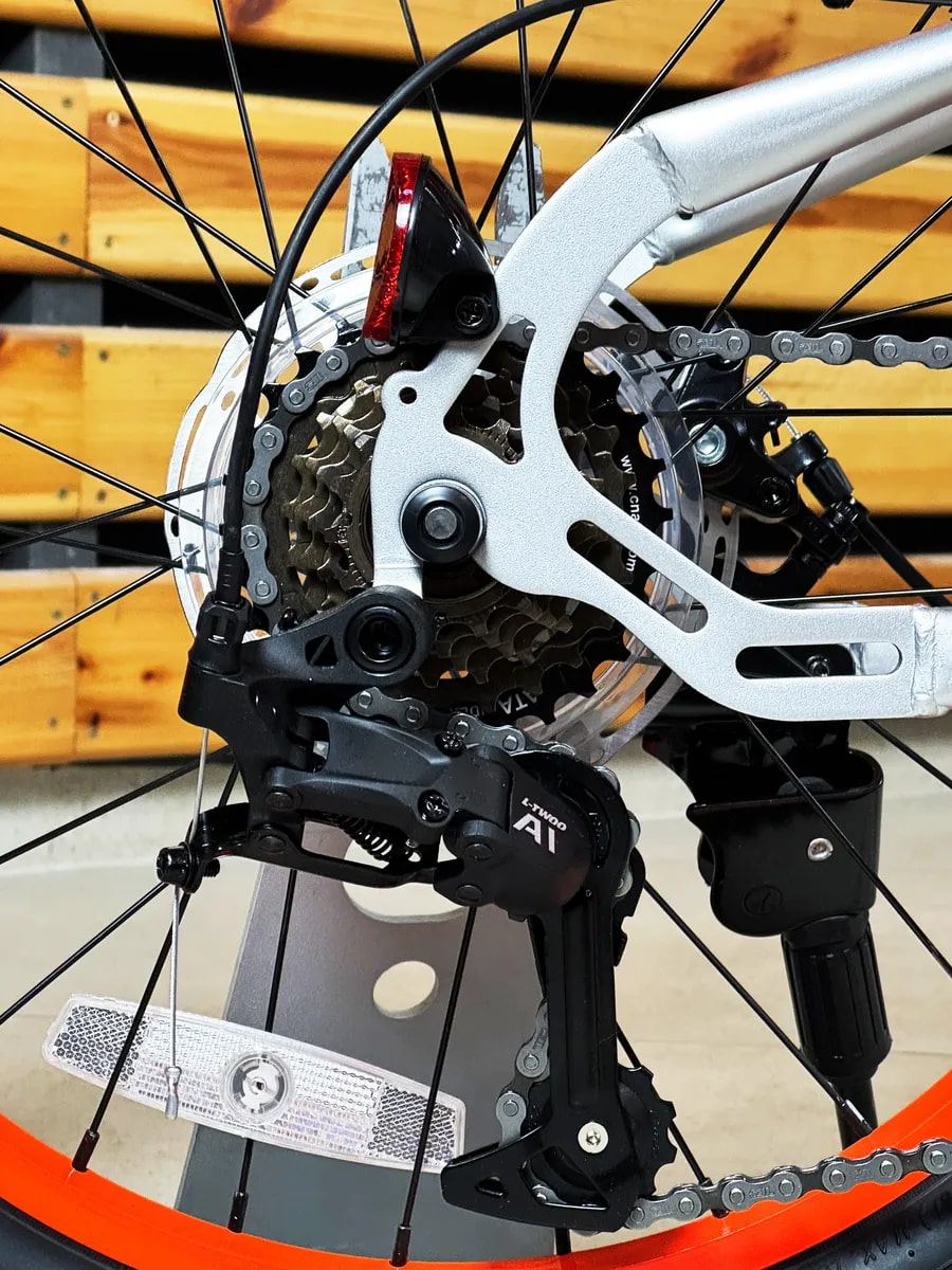 Байк оборудован семискоростной трансмиссией, включающей в себя систему HDL на одну звезду спереди и трещотку на 6 звёзд сзади. Соответственно, управлять необходимо только задним переключателем L-TWOO.