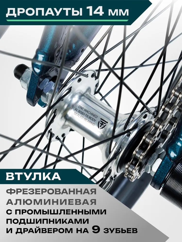 Втулка задняя: алюминиевая, пром. подшипники, интегрированный фривил 9 зубьев. ось M14 (14 мм).