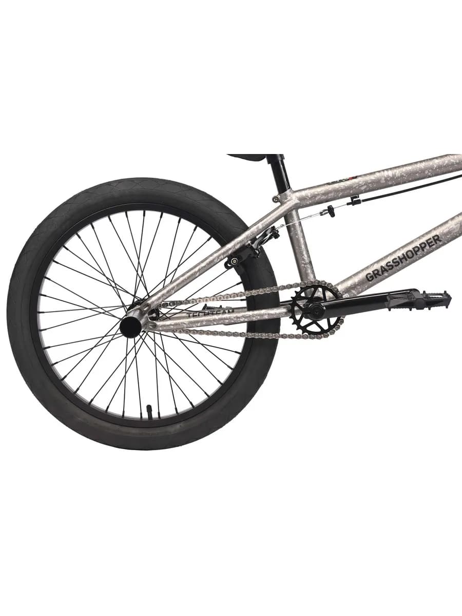 Это БМХ продвинутого уровня, трюковой и прыжковый, подходит для Street и Dirt спотов. Размер рамы 20.4 дюйма для Райдера ростом от 155 до 175 см. Трехкомпонентная система стандарта Spanish с алюминиевой ведущей звездой на 25 34;зубов 34;, очень надежна при выполнении трюковых элементов, задняя звезда на 8 34;зубов 34;. Такое соотношение идеально, что бы взять быстрый разгон перед трамплином или подкрутить педали, если скорости не достаточно для вылета по правильному радиусу. На этом велосипеде установлен один задний тормоз, в основном его используют, чтобы сбросить скорость в самом конце серии из трамплинов. Колеса собраны на двойных алюминиевых ободах - ведь прочные колеса, важная часть экстремального велосипеда. Интегрированная рулевая Neco, алюминиевые педали Wellgo, алюминиевый вынос ТТ - все это делает Grasshopper легким и надежным.