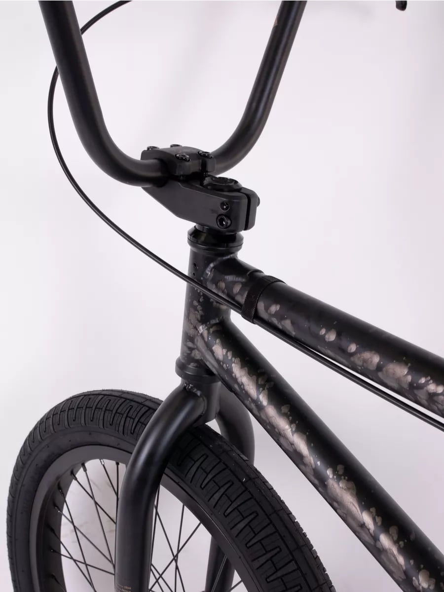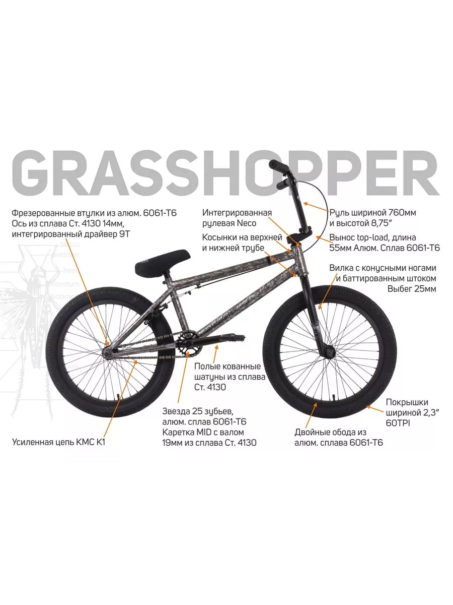 Это БМХ продвинутого уровня, трюковой и прыжковый, подходит для Street и Dirt спотов. Размер рамы 20.4 дюйма для Райдера ростом от 155 до 175 см. Трехкомпонентная система стандарта Spanish с алюминиевой ведущей звездой на 25 34;зубов 34;, очень надежна при выполнении трюковых элементов, задняя звезда на 8 34;зубов 34;. Такое соотношение идеально, что бы взять быстрый разгон перед трамплином или подкрутить педали, если скорости не достаточно для вылета по правильному радиусу. На этом велосипеде установлен один задний тормоз, в основном его используют, чтобы сбросить скорость в самом конце серии из трамплинов. Колеса собраны на двойных алюминиевых ободах - ведь прочные колеса, важная часть экстремального велосипеда. Интегрированная рулевая Neco, алюминиевые педали Wellgo, алюминиевый вынос ТТ - все это делает Grasshopper легким и надежным.