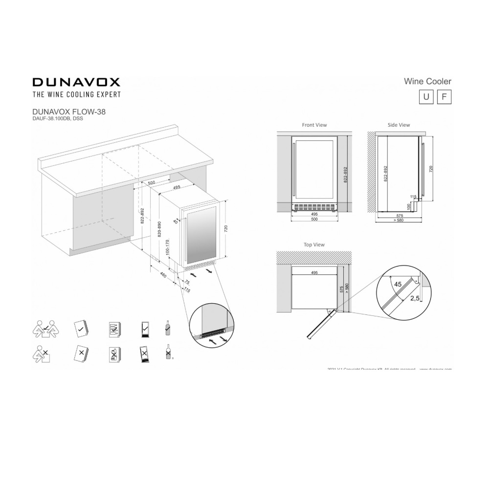 Винный шкаф DAUF-38.100DSS входит в серию «FLOW». В линейке представлено оборудование премиум-класса шириной, соответствующей стандартным кухонным модулям, оснащены съемной вентиляционной решеткой, которая находится в нижней части корпуса. Они как устанавливаются под столешницу, так и используются как отдельностоящие устройства. В серию входят модели различных вариациях: со стандартными и скрытыми ручками, а также с инновационной технологией push-to-open (открытие одним нажатием).