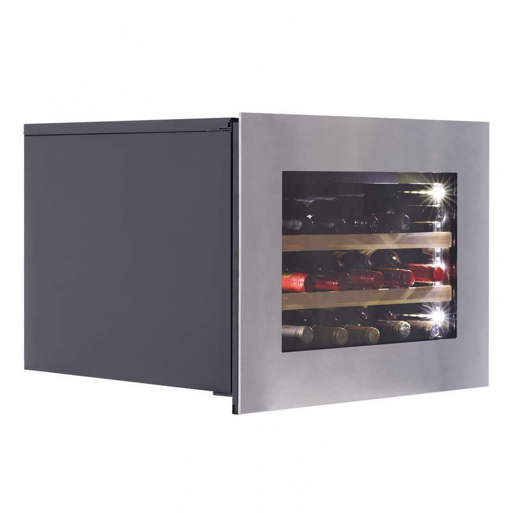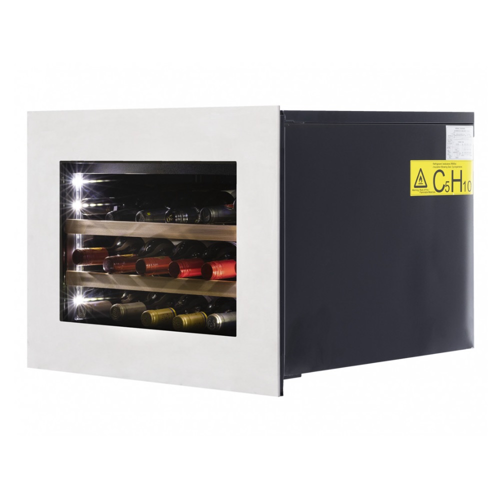 Лаконичный дизайн шкафа придаёт интерьеру современный вид. Чёрный корпус и рамка из бесшовной нержавеющей стали добавляют элегантности и солидности. В этой модели использовано панорамное освещение синего, янтарного и белого цвета, которое обеспечивает равномерную подсветку всех полок. (Освещение плавно включается при открывании дверцы, а через пару секунд после закрытия плавно гаснет.) Дополнительно у данной модели шкафа предусмотрен демонстрационный режим, во время которого освещение не гаснет. Такая функция помогает демонстрировать винную коллекцию Вашим друзьям и близким.