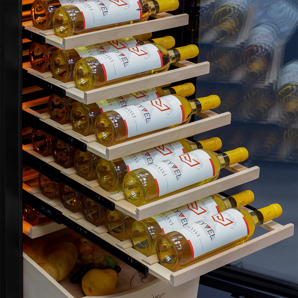 Дверь имеет двойное стекло (максимальная защита), которое задерживает губительные для вина ультрафиолетовые лучи. Внутренние пространство разделено на 2 зоны с возможностью раздельной настройки температуры. Так что Вы всегда сможете хранить все виды вин при идеальной температуре или установить разные значения, что бы напитки всегда были готовы к подаче. Идеальной температурой хранения вина считается температура +12°C. Подаются розовые и сухие белые вина обычно при температуре от +8°C до +14°C, игристые вина и шампанское при +6°C до +8°C, а легкие красные вина - при +13°C и насыщенные красные вина при +15°C - +19C°. В каждой из зон установлен специальный вентилятор, который не даст воздуху застояться и равномерно распределяет охлаждённый воздух по всему пространству. Угольный фильтр гарантирует чистоту воздуха и отсутствие посторонних запахов. Менять угольный фильтр рекомендуется 1 раз в год. Дополнительно рекомендуем приобрести сразу 2-3 фильтра, чтобы при необходимости он всегда был под рукой.