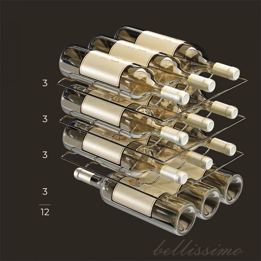 Несмотря на компактность, внутреннее устройство продумано до мелочей. Три металлические полки рассчитаны на стандартные бутылки «Бордо», а мягкая подсветка включается и выключается кнопкой, поэтому нужная бутылка найдётся даже вечером.
