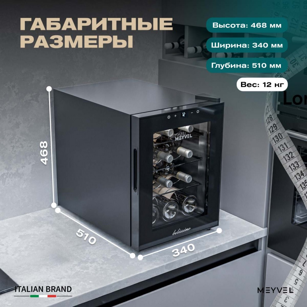 Meyvel MV12-TBF1 — это винный шкаф, рассчитанный на 12 бутылок, а значит, подойдёт не только коллекционерам, но и тем, кто просто любит держать под рукой пару любимых сортов для ужина или праздничного вечера. Благодаря термоэлектрической системе охлаждения он работает тихо, стабильно и не требует сложного обслуживания.