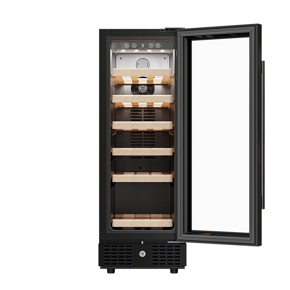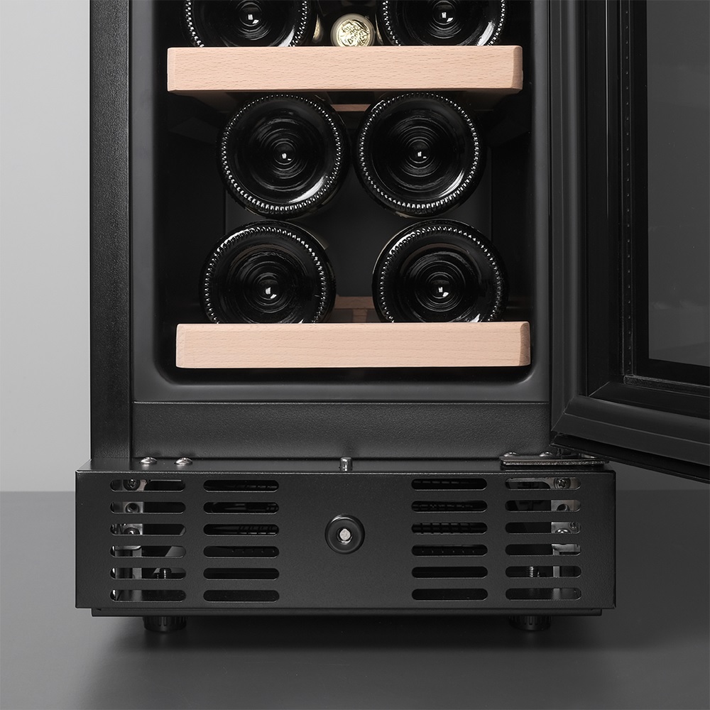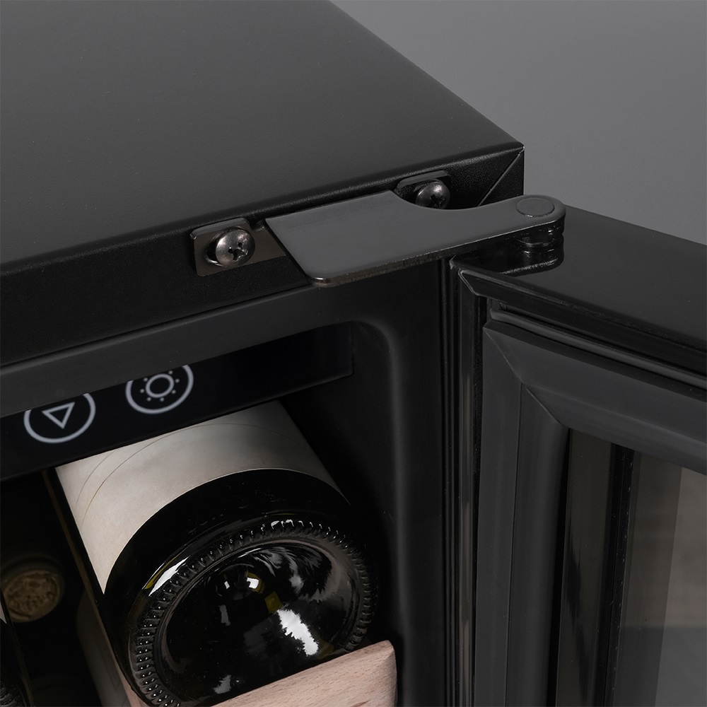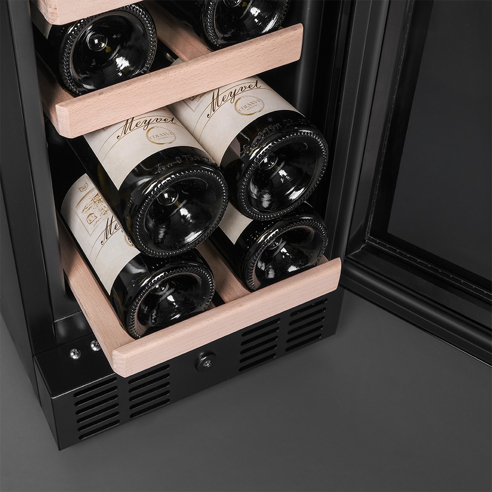 Meyvel MV19BIG-KBT1 вмещает до 19 бутылок типа «Бордо» — это может быть небольшая винотека, тщательно подобранная для особых поводов. Такая система хранения подходит тем, кто выбирает не «много», а «точно». Бутылки располагаются на полках из бука горизонтально, чтобы предотвратить пересыхание пробки. Это не просто эстетика, а практический подход к защите аромата и вкуса напитка.