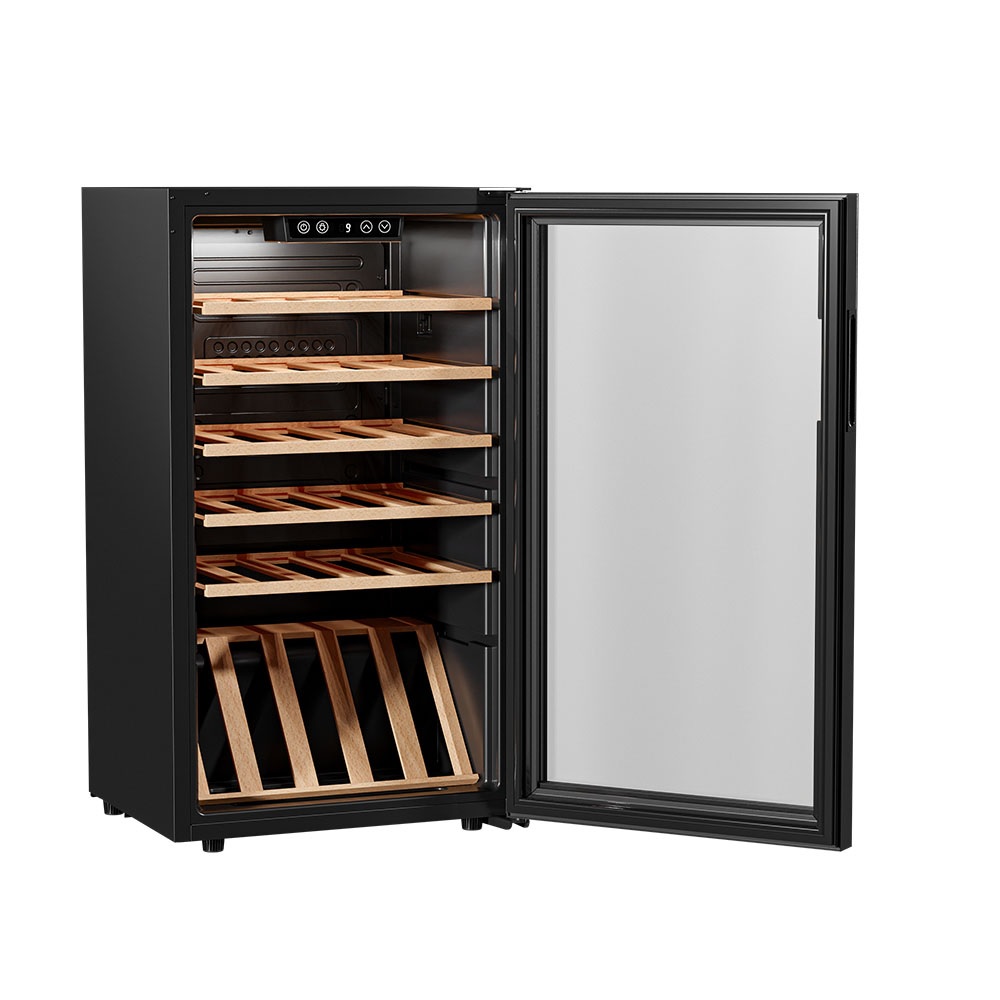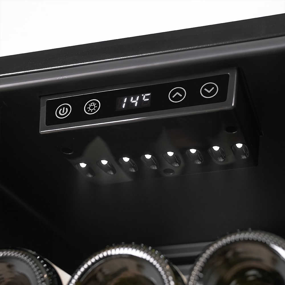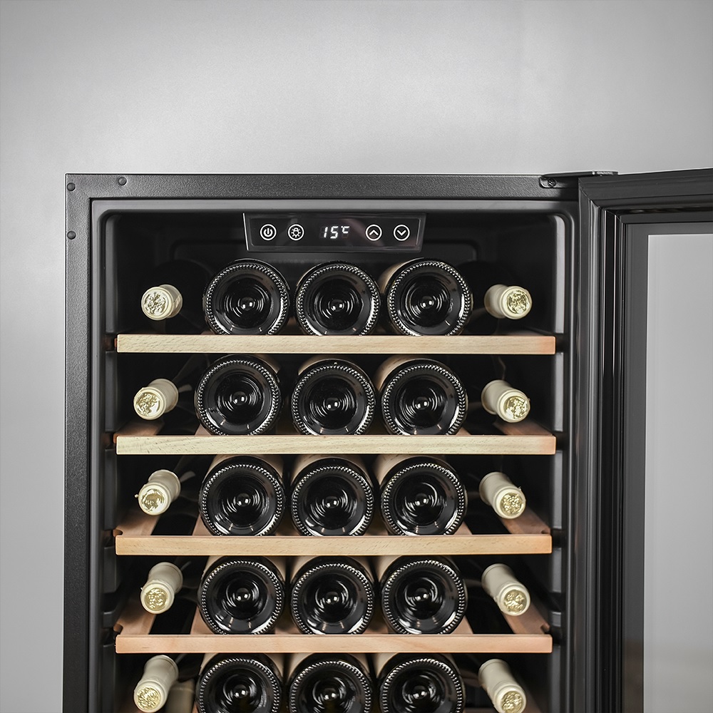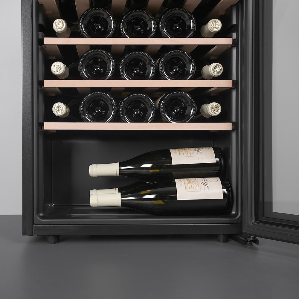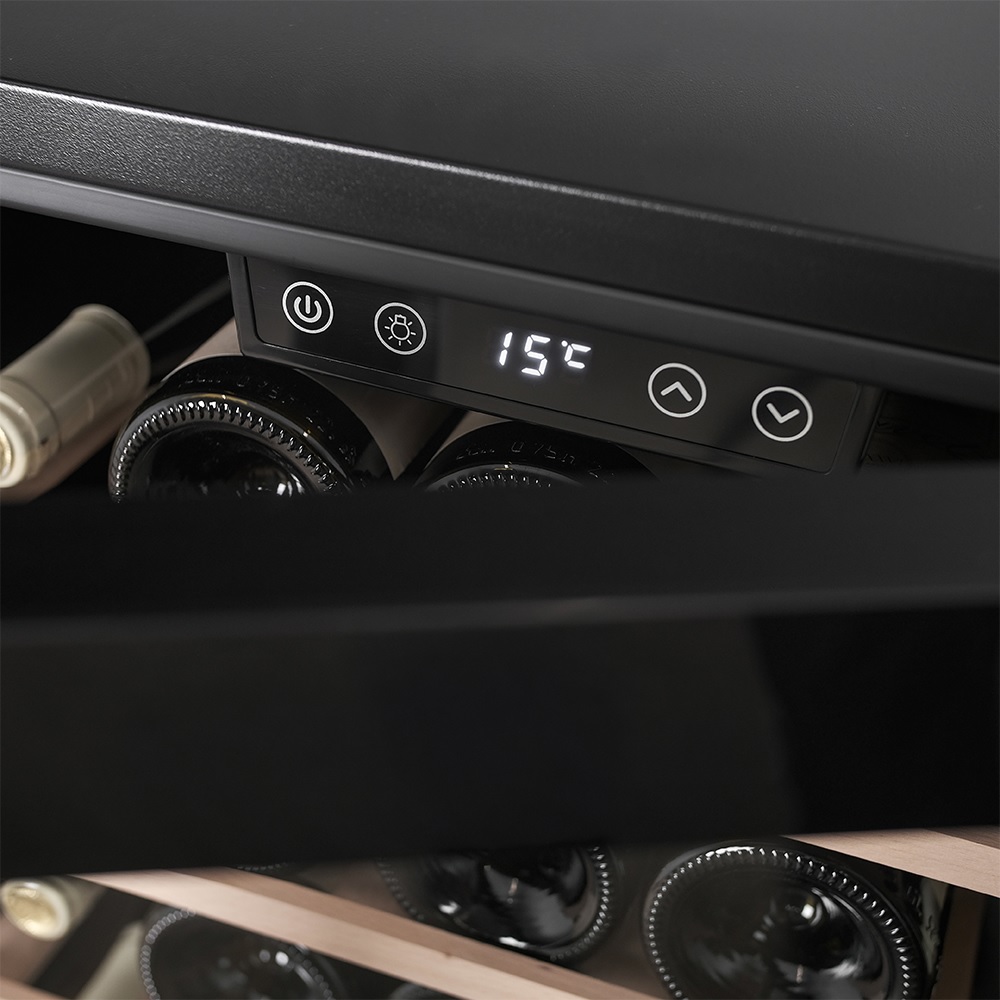 Конструкция шкафа продумана до мелочей. Благодаря регулируемым ножкам его без опасений можно устанавливать даже на неровном полу. Это важно для стабильной работы компрессора и правильного распределения температуры. Утопленная ручка двери — решение, которое делает внешний облик устройства лаконичнее и одновременно защищает от случайных зацепов. Такая ручка не выступает за габариты и особенно удобна в компактных пространствах. Для дополнительной безопасности предусмотрена блокировка панели управления — нужная функция, если в доме есть дети. Также при отклонении температуры активируется сигнализация: шкаф сам оповестит, что условия изменились и вино может оказаться под угрозой.