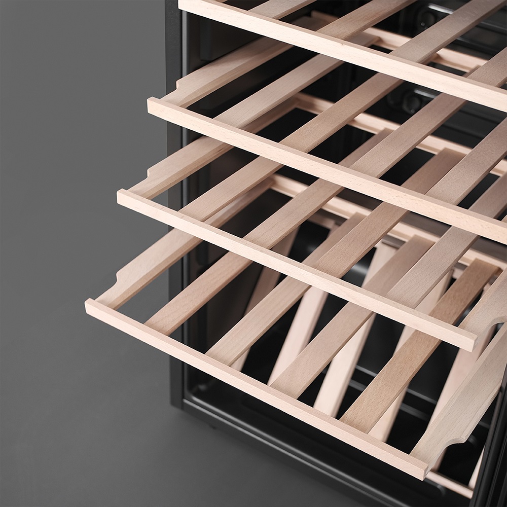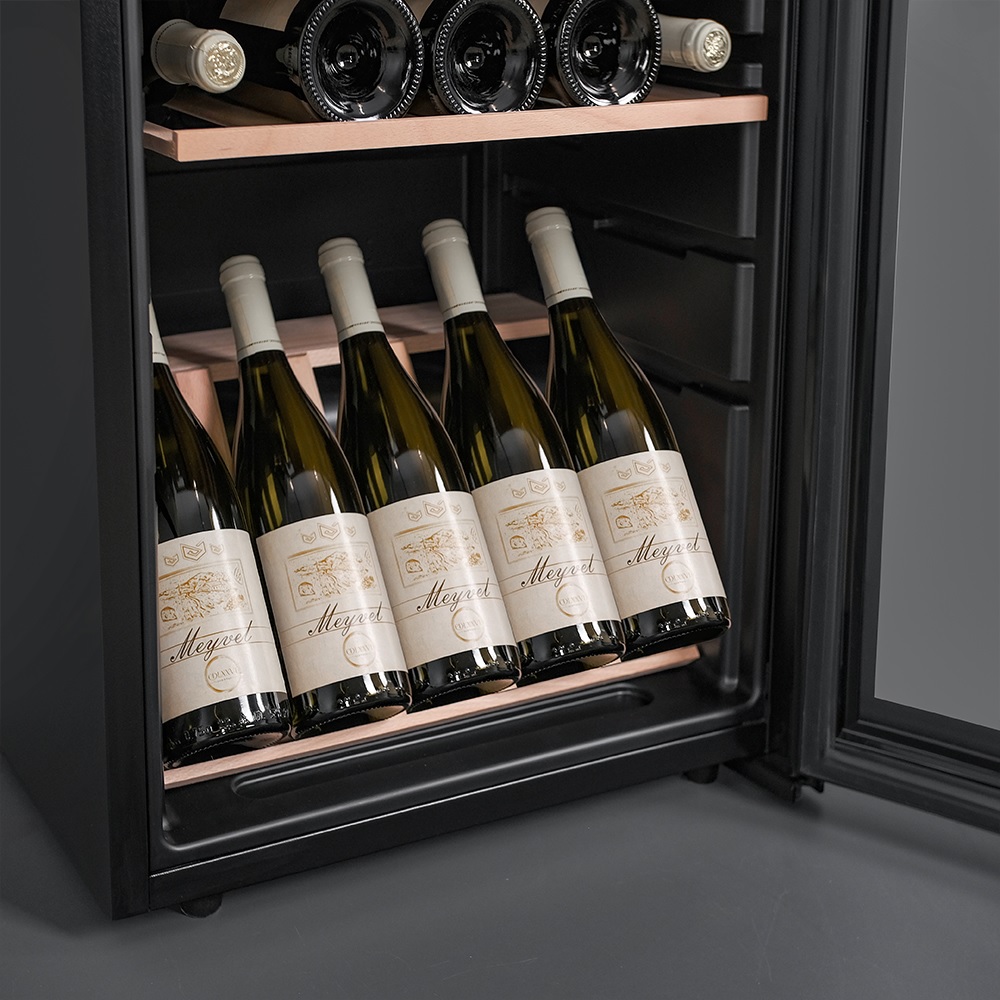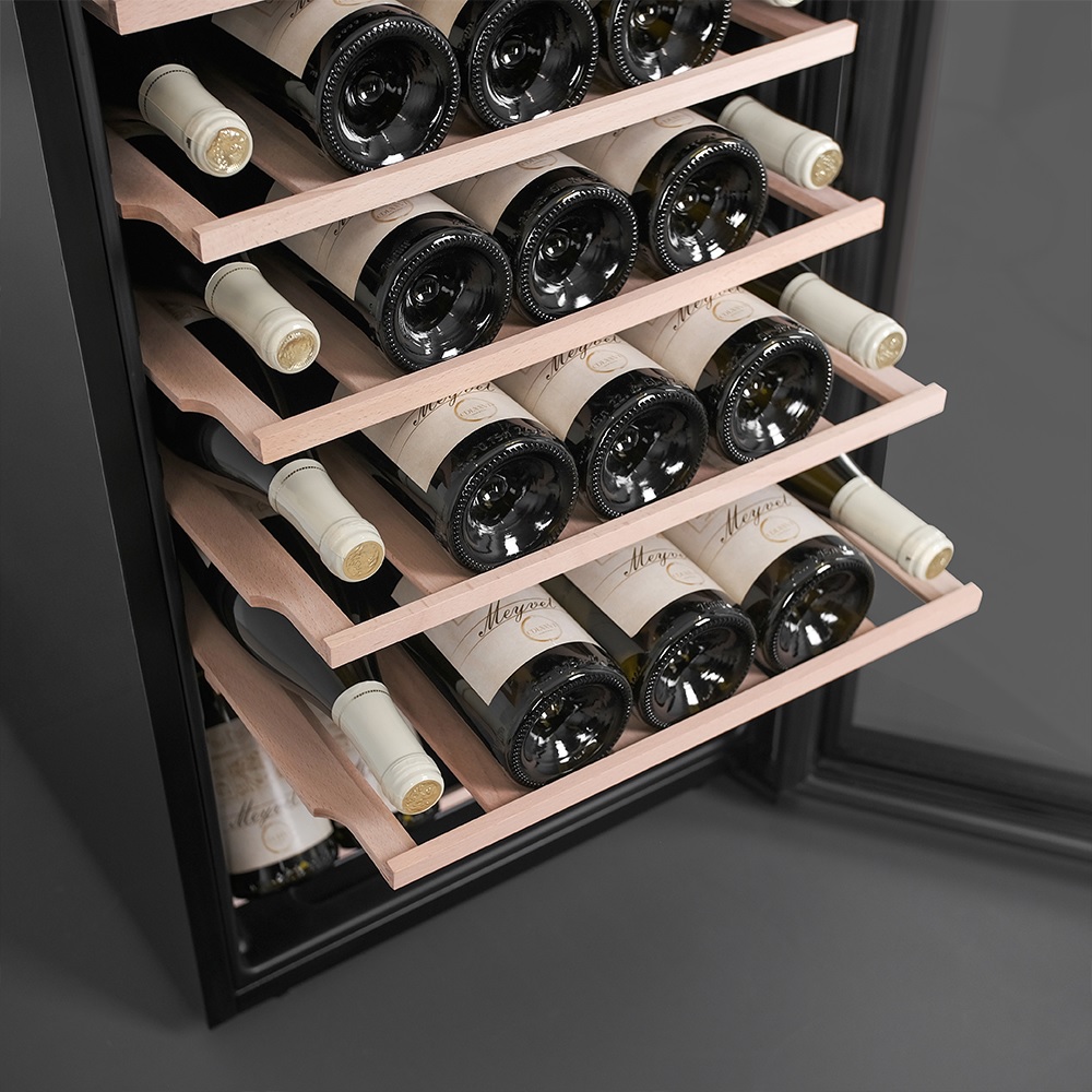 Стандартная вместимость шкафа — 30 бутылок типа «Бордо», но при желании можно расширить её до 33, просто установив дополнительную полку (приобретается отдельно). В базовой комплектации — пять полок из натурального бука и одна демонстрационная, предназначенная для красивой выкладки лучших экземпляров коллекции. Презентационная полка располагает бутылки под углом, подчёркивая их этикетки и превращая винный шкаф в мини-галерею. Освещение внутри мягкое и включается нажатием кнопки. Этот акцент делает вечернее знакомство с коллекцией особенно атмосферным.