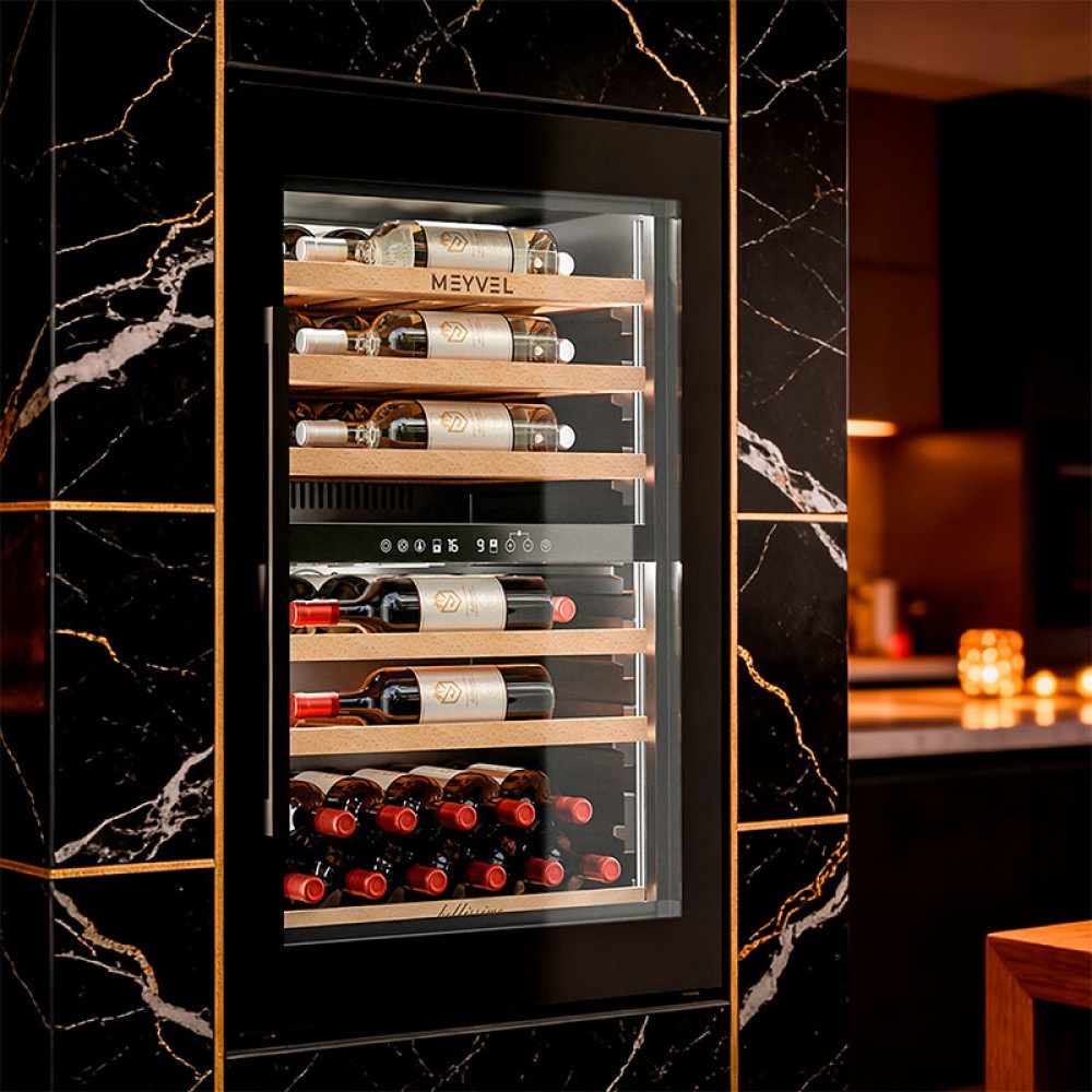Встроенная система вентиляции решает сразу несколько задач — и технических, и эстетических. Она выведена на фасад шкафа, поэтому воздухообмен происходит спереди, а винный шкаф можно встраивать без зазоров и без каких-либо вырезов в мебели сверху или снизу. Дополнительный плюс — экономия на производстве мебели: конструкция для встройки обходится дешевле, а изготовить её проще. При этом сам винный шкаф работает лучше, температура держится стабильнее, а холод равномерно распределяется, создавая действительно правильные условия хранения.