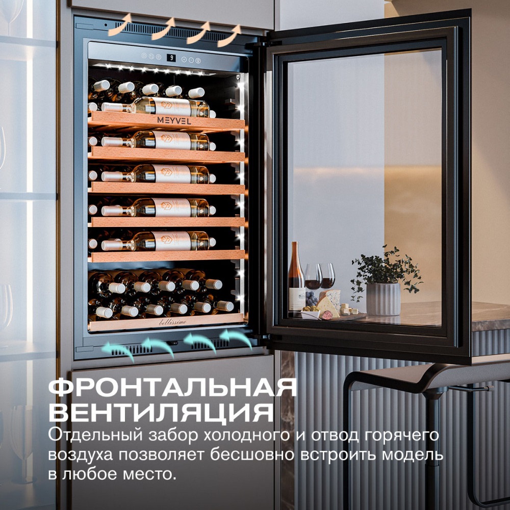 Встроенная система вентиляции решает сразу несколько задач — и технических, и эстетических. Она выведена на фасад шкафа, поэтому воздухообмен происходит спереди, а винный шкаф можно встраивать без зазоров и без каких-либо вырезов в мебели сверху или снизу. Дополнительный плюс — экономия на производстве мебели: конструкция для встройки обходится дешевле, а изготовить её проще. При этом сам винный шкаф работает лучше, температура держится стабильнее, а холод равномерно распределяется, создавая действительно правильные условия хранения.