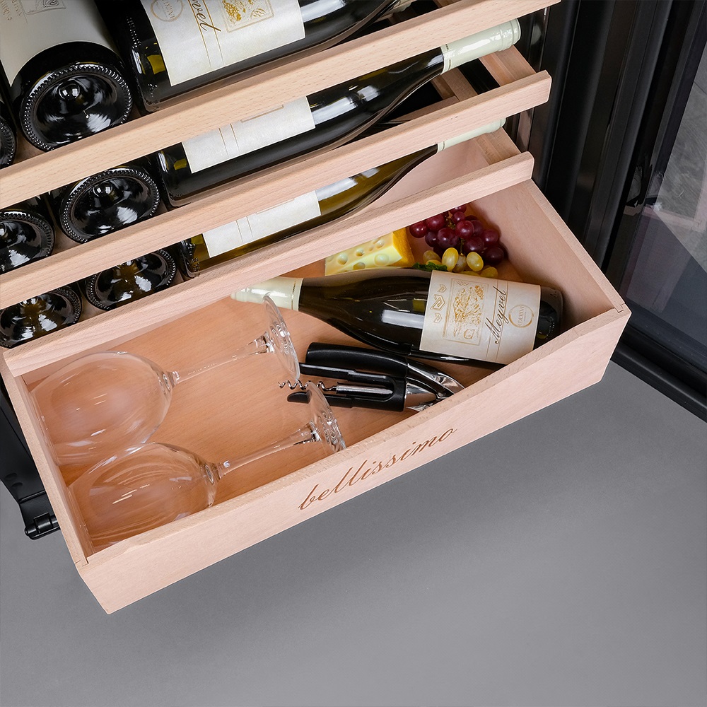 Благодаря увеличенному расстоянию между полками - общая вместимость винного шкафа больше, чем у аналогичных моделей, и на любой полке Вы сможете разместить нестандартные бутылки - например «Магнум». Одна из полок сделана в виде специальной полки-трансформера. Её можно использовать как стандартную полку, или как демонстрационную. В этом случае бутылки будут располагаться под наклоном, для демонстрации Вашей винной коллекции. Внизу винного шкафа расположен выдвижной ящик - в нем Вы можете хранить вино в бутылках или винные атрибуты (штопор, бокалы, аэраторы, декантеры, каплеуловители, термометры и т.д.).