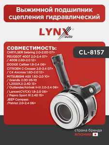 Выжимной подшипник сцепления гидравлический LYNXauto CL-8157. Для: MITSUBISHI ASX 1.6D-2.0 10> / Grandis 2.0D 05-10 / L200(KJ) 2.4D 15> / Lancer(CY/CX) 1.8-2.0 08> / Outlander/Airtrek II-III 2.0-2.4 06> / Pajero Sport III 2.4D 15>, CHRYLSER Sebring 2.0-2.0D 07>, CITROEN C-Crosser 2.0-2.4 07> / C4 Aircross 1.6D-2.0 12>, DODGE Caliber 1.8-2.4 06>, JEEP Compass/Patriot 2.0-2.4 06>, PEUGEOT 4007 2.0-2.4 07> / 4008 2.6D-2.0 12>