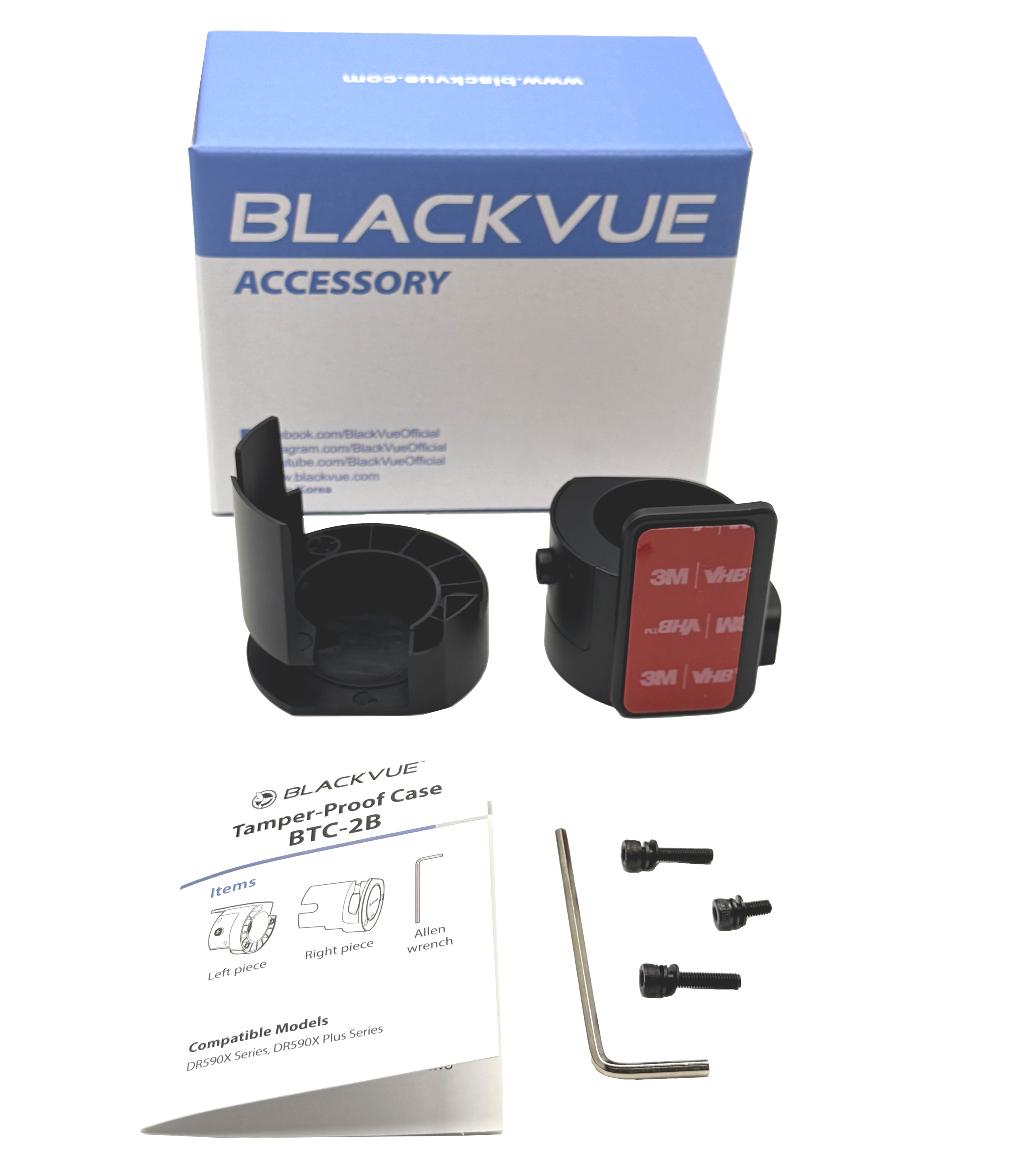 Blackvue BTC-2В - это защищенный от несанкционированного доступа замок для видеорегистраторов BlackVue. Он устанавливается на корпус переднего блока и предотвращает форматирование или извлечение SD-карты, отсоединение силовых или коаксиальных кабелей и снятие видеорегистратора с крепления. Он запирается с помощью шестигранных болтов, а для запирания и отпирания корпуса предоставляется шестигранный ключ.