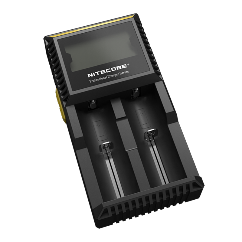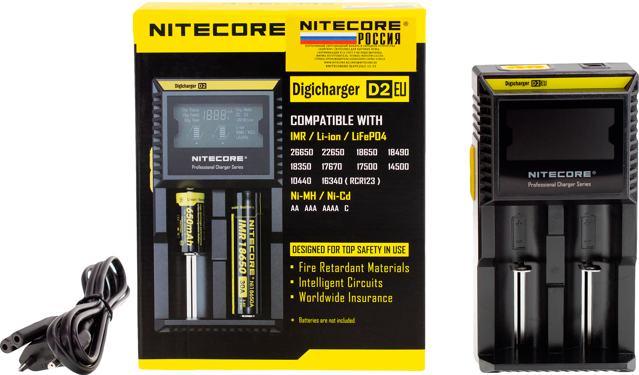 Nitecore D2 - универсальное интеллектуальное зарядное устройство, совместимое практически со всеми цилиндрическими аккумуляторами, тем самым устраняющее необходимость иметь несколько зарядных устройств. D2 автоматически распознает литий-ионные, никель-металл-гибридные и никель-кадмиевые аккумуляторы, а также возможна зарядка Литий-железо-фосфатных батареи через ручной выбор. Электронная схема интеллектуального зарядного устройства выбирает оптимальный режим зарядки (CC, CV и DV/DT) для данного аккумулятора, затем каждый из двух управляемых микрокомпьютером зарядных слотов контролирует и заряжает аккумулятор самостоятельно. Интегрированный цифровой LCD-дисплей отображает прогресс зарядки, напряжения, тока и времени, а функция интеллектуального автоматического выключения питания своевременно сработает, когда зарядка будет завершена.
