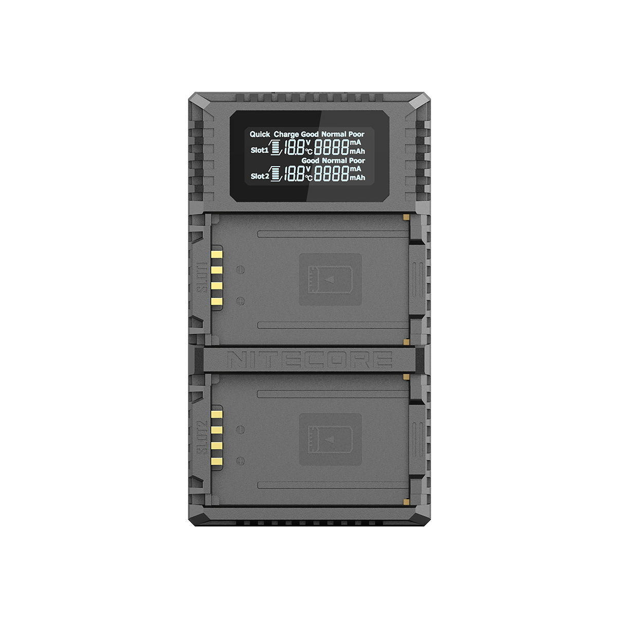 «Быстрая зарядка»: при подключении зарядного устройства к источнику питания с напряжением более 9 В автоматически применяется технология Quick Charge 2.0. 1 аккумулятор заряжается с предельно возможным током 1200 mAh, 2 аккумулятора - с током по 800 mAh на каждый канал. При активации режима быстрой зарядки на дисплее появится уведомление в виде специального значка;