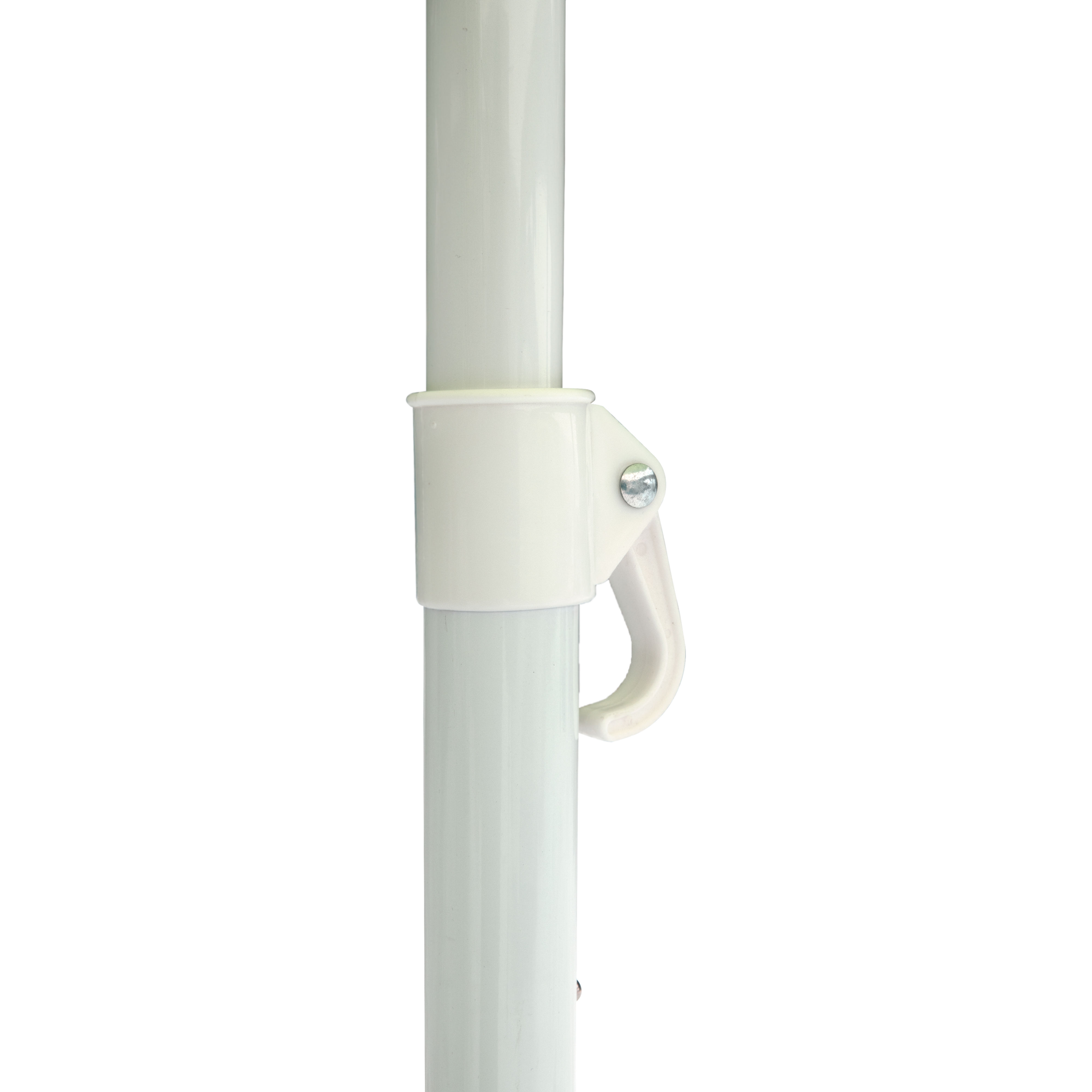 Шток выполнен из нержавеющей стали и состоит из двух частей: верхней (140 см) и нижней (100 см), что даёт общую высоту зонта — 230 см. Диаметр штока — 28/32 мм (ступенчатый), что повышает прочность конструкции. Длина дуги по куполу — 240 см, а реальный диаметр тени — около 200 см.